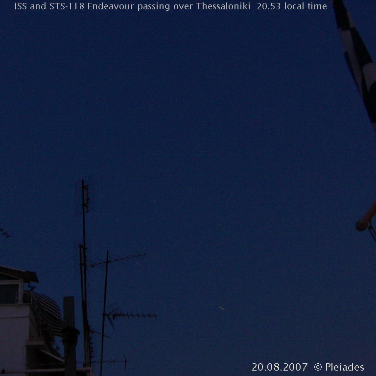 Γεια σας! Το χθεσινο βραδακι (Δευτερας εννοω) ήταν απο τα καλυτερα για την σχετικη παρατηρηση! Κρατησε περισσοτερο η κοινη πορεια τους στον ουρανο ωσπου να εξαφανιστουν απο το οπτικο μου πεδιο... Αργησαν να εμφανιστουν ομως και ανησυχησα....(ετσι νομιζα... ) Ειδα πρωτα τον ISS μονο του και λιγα δευτερολεπτα μετα, εμφανιστηκε και το Endeavour αρκετα πιο πισω του και πιο ψηλα σε σχεση με τον ISS... Ευτυχως χθες ειχα οργανωθει καλυτερα, κι ετσι μπορεσα να βγαλω καποιες φωτογραφιες με πιο αυξημενες τις πιθανοτητες επιτυχιας απο τις προηγουμενες φορες κι ετσι, με μεγαλη χαρα και ικανοποιηση τις μοιραζομαι μαζι σας. Σημειωσεις: Οι φωτογραφιες βγηκαν με μια απλη HP photosmart M307 στην ρυθμιση selftimer γιατι εχω παρατηρησει απο αλλες φορες οτι εκει βγαζει καλυτερα και μενει λιγο περισσοτερο ανοιχτο το διαφραγμα...και δεν ακουμπας και την μηχανη!!! Επισης την ειχα τοποθετησει σε ενα τριποδα παλιας τεχνολογιας γι αυτο και το αποτελεσμα της 4ης φωτογραφιας Εβγαλα και με μηχανη με φιλμ, αλλα τα αποτελεσματα θα αργησουν λιγακι...ελπιζω κατι να επιασε κι εκει... Αυτα απο μενα... κλεινοντας να ευχηθω καλη προσγειωση στο πληρωμα του Endeavour που μου κρατουσε παρεα αυτες τις μερες παρακολουθωντας τους μεσα απο την nasa tv και καλη συνεχεια στο πληρωμα του ISS που "μας βλεπει" απο κει πανω καθε μερα... Μην ξεχναμε οτι ειναι και ο Θοδωρης εκει!!! Πρωτα ειδα τον ISS ... Δεξια απο την κεραια ειναι o ISS πιο φωτεινος και στο κεντρο το Endeavour λιγο πιο αχνο... Στο κεντρο δεξια ειναι o ISS πιο φωτεινος και πανω κοντα στην κεραια, το Endeavour λιγο πιο αχνο... Αυτη βγηκε ποιο σκοτεινη γιατι ειχα κανει ζουμ και νομιζω οτι κρατουσα την μηχανη στον τριποδα επανω, γι αυτο και δεν φαινεται ευθεια η τροχια τους.... -