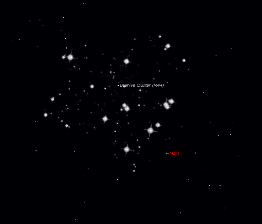 Τα ξημερώματα Κυριακής προς Δευτέρα ο πλανήτης Άρης θα περάσει "ξυστά" από το ανοικτό σμήνος Μ44, γνωστό ως φάτνη ή κυψέλη. Η καλύτερη ώρα να παρατηρήσει κανείς το φαινόμενο είναι πριν το λυκαυγές ώστε να έχει ανέβει σε ικανοποιητικό ύψος (20 μοίρες, στα ανατολικά στις 5:45 π.μ). Ο Άρης και το σμήνος ανατέλλουν περίπου στις 4 π.μ. και θα είναι ορατά έως την ανατολή του ήλιου. Το Μ44 είναι εύκολα ορατό με γυμνά μάτια σε αρκετά σκοτεινούς ουρανούς. Η συνύπαρξή του με έναν πλανήτη φαινόμενου μεγέθους +1.65 θα είναι ιδιαίτερα ενδιαφέρουσα και για παρατήρηση με γυμνούς οφθαλμούς από την ύπαιθρο και δυνατή με κιάλια ή τηλεσκόπιο από παντού. Οι κάτοικοι των πόλεων ενδεχομένως να δυσκολευτούν αν έχουν φωτορύπανση στον ορίζοντα και συνίσταται να παρατηρήσουν σε μεγαλύτερο ύψος. Στη συνημμένη εικόνα μπορείτε να δείτε μια εξομοίωση του φαινομένου από το starry night. Ο Άρης παρόλο που εμφανίζεται μικρότερος είναι πολύ λαμπρότερος από τα αστέρια του σμήνους.