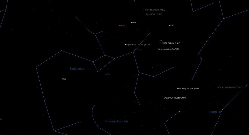 18. Ο νάνος πλανήτης Πλούτωνας είναι σε αντίθεση σήμερα. Αυτό σημαίνει πως βρίσκεται απέναντι από τον ήλιο, ανατέλλει με τη δύση του και μεσουρανεί στο μέσο τη νύχτας. Βρίσκεται στον αστερισμό του Τοξότη και έχει φαινόμενο μέγεθος +14. Για να τον δείτε χρειάζεστε: -Ένα μεγαλούτσικο τηλεσκόπιο (8 ίντσες και πάνω, ανάλογα και με τον ουρανό) -Έναν χάρτη ακριβείας από αστρονομικό πρόγραμμα για την ακριβή ώρα και μέρα της παρατήρησης -Το δυνατόν σκοτεινότερο ουρανό στα νότια Ο Πλούτωνας μεσουρανεί στη 1:30 περίπου σε ύψος μόλις 32 μοιρών. Το χαμηλό ύψος είναι και η μεγαλύτερη δυσκολία στη συγκεκριμένη αντίθεση, σε συνδυασμό και με το πλούσιο αστρικό πεδίο στην περιοχή του Τοξότη. Συνημμένο βλέπετε έναν χάρτη που δείχνει την ευρύτερη περιοχή που βρίσκεται ο Πλούτωνας. Για την αναζήτησή εκτυπώστε έναν χάρτη προσαρμοσμένο στην ακριβή ώρα παρατήρησης και στο πεδίο του τηλεσκοπίου σας (Προτείνουμε τους χάρτες του Cartes du Ciel). Όσοι έχουν Go-to μπορούν να το χρησιμοποιήσουν (χρειάζεται ώρα και συντεταγμένες με πολύ καλή ακρίβεια) αλλά ένας χάρτης θα βοηθήσει και σε αυτή την περίπτωση να αναγνωριστεί ο Πλούτωνας καθώς δε φαίνεται παρά ως ένα αστέρι 14ου μεγέθους. Καλή επιτυχία σε όσους το επιχειρήσουν!