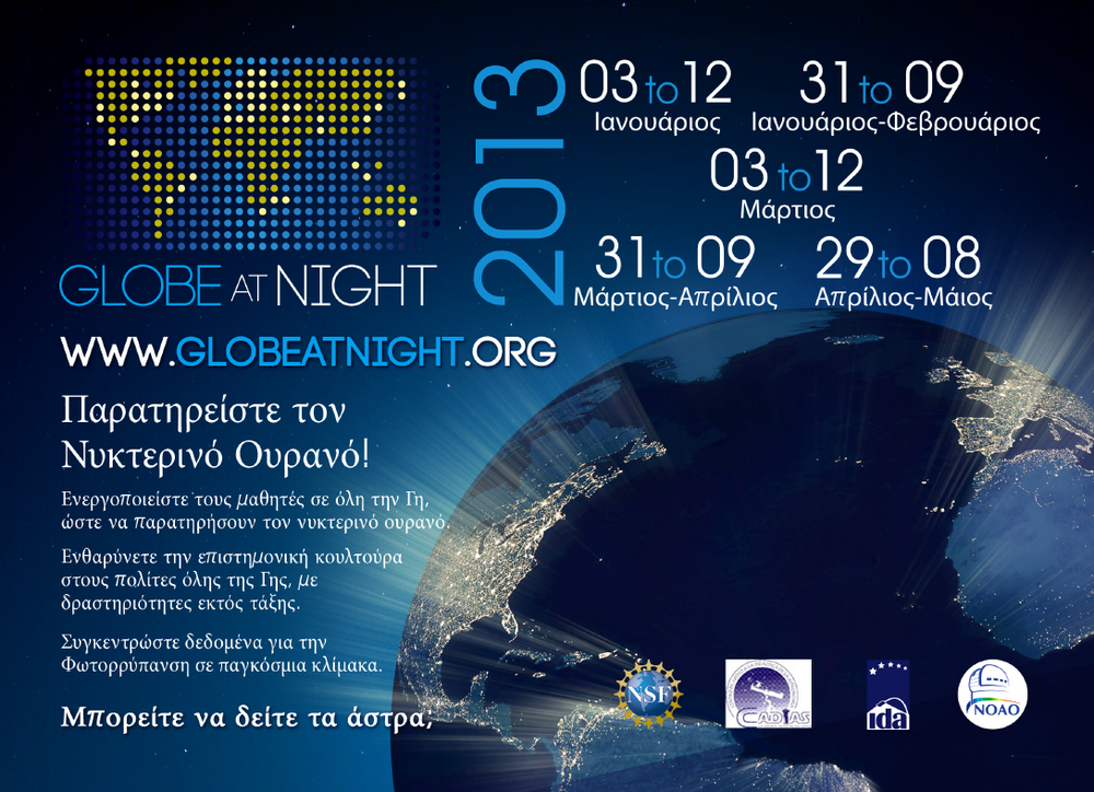 Το Globe at Night είναι μία παγκόσμια εκστρατεία καταγραφής της φωτορύπανσης. Για μερικές, εβδομάδες άνθρωποι σε ολόκληρο τον κόσμο μετράνε τα αστέρια στον αστερισμό του Ωρίωνα ή του Λέοντα και υποβάλουν τις μετρήσεις τους. Μερικές εβδομάδες αργότερα οι διοργανωτές δημοσιεύουν τον παγκόσμιο χάρτη με τα επίπεδα φωτορύπανσης. Τα τελευταία χρόνια έχουν υποβληθεί δεκάδες χιλιάδες μετρήσεις από περισσότερες από 100 χώρες. Για το 2013 η καταγραφή θα γίνει σε πέντε ημερομηνίες. Η πρώτη από 3 έως 12 Ιανουαρίου, η δεύτερη από 31 Ιανουαρίου έως 9 Φεβρουαρίου, η τρίτη από 3 έως 12 Μαρτίου , η τέταρτη από 31 Μαρτίου έως 9 Απριλίου και η πέμπτη από 29 Απριλίου έως 8 Μαΐου για το βόρειο ημισφαίριο. Περισσότερα: http://www.darksky.gr/recordinglightpollution/globeatnight.html Επίσημη σελίδα: http://www.globeatnight.org/ -