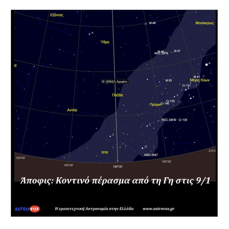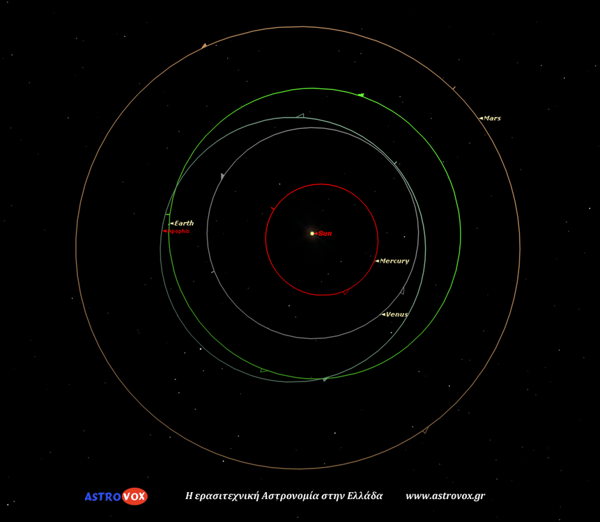 Ο αστεροειδής (ΝΕΟ) 99942 Άποφις κάνει αύριο κοντινό πέρασμα από τη Γη, στα 14,5 εκατομμύρια χιλιόμετρα. Θα έχει φαινόμενο μέγεθος περίπου 16. Μπορεί να αποτυπωθεί φωτογραφικά και ίσως και να παρατηρηθεί οριακά από πολύ μεγάλα ερασιτεχνικά τηλεσκόπια σε σκοτεινό ουρανό. Ο αστεροειδής αυτός, διαμέτρου 300 μέτρων, έγινε διαβόητος όταν αρχικές εκτιμήσεις της τροχιάς του έδιναν μη-ασήμαντη πιθανότητα πρόσκρουσης στη Γη. Καλύτερες μετρήσεις μετέπειτα έδειξαν ότι οι πιθανότητες είναι απειροελάχιστες. Σύνδεσμοι: http://neo.jpl.nasa.gov/apophis/ http://el.wikipedia.org/wiki/99942_%CE%86%CF%80%CE%BF%CF%86%CE%B9%CF%82 Η θέση του αστεροειδή απόψε στις 2:30 Οι τροχιές των πλανητών και του Άποφι με σημειωμένο το κοντινό πέρασμα. -