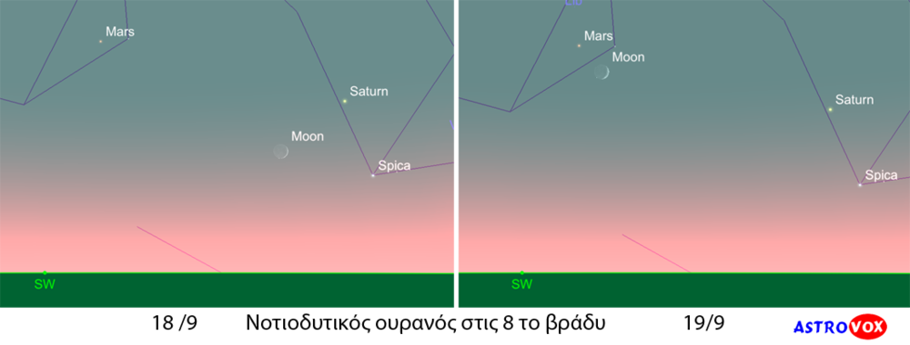9. Πάντα η Σελήνη στις πρώτες ημέρες της είναι ένα ιδιαίτερο θέαμα στο λυκόφως. Αυτές τις ημέρες, μετά τη δύση του ήλιου αναζητήστε την στο νοτιοδυτικό ουρανό, κοντά στον Κρόνο σήμερα και στον Άρη αύριο. Κοντά στην περιοχή θα βρίσκεται και ο λαμπρός Στάχυς (Spica).