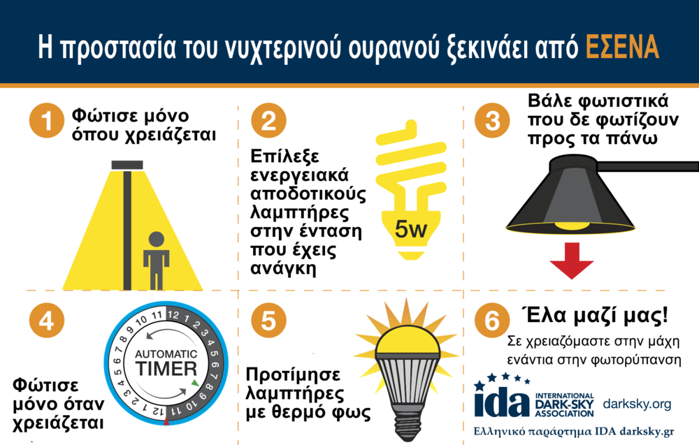 18. Διεθνής εβδομάδα σκοτεινών ουρανών Συμβουλή #3: Έξι εποπτικά βήματα για μείωση της φωτορύπανσης - ενημερώστε γνωστούς και φίλους με την κάρτα μας!