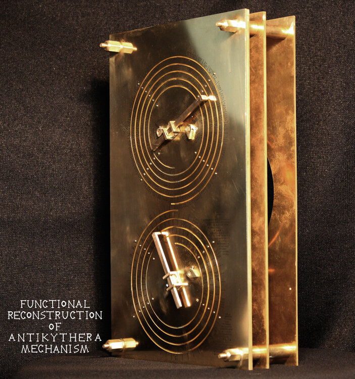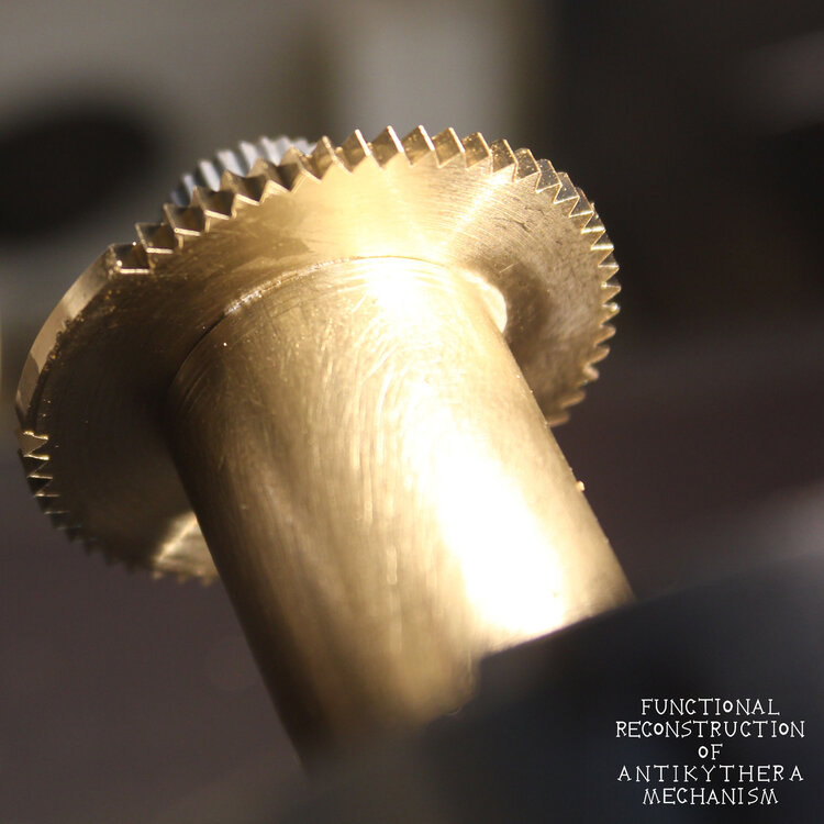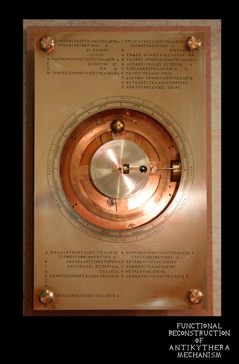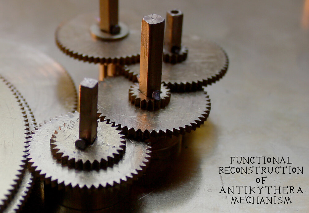 Φωτό 4: η οπίσθια όψη του λειτουργικού ομοιώματος του Μηχανισμού των Αντικυθήρων, διακρίνονται οι Σπείρες των ενδείξεων του Μέτωνα (επάνω) και του Σάρου (κάτω) Φωτό 3: η πρόσθια όψη του λειτουργικού ομοιώματος του Μηχανισμού των Αντικυθήρων, διακρίνονται το ‘’Χρυσούν Σφαιρίον’’ (ο Ήλιος) και ο κεντρικός δίσκος της Σελήνης. Περιμετρικά αναγράφονται οι αιγυπτιακοί μήνες και οι Ζωδιακοί Αστερισμοί Φωτό 2: στιγμιότυπο της συναρμολόγησης του λειτουργικού ομοιώματος του Μηχανισμού των Αντικυθήρων Φωτό 1: στιγμιότυπο από την κατασκευή ενός ομοιώματος γραναζιού του Μηχανισμού των Αντικυθήρων -