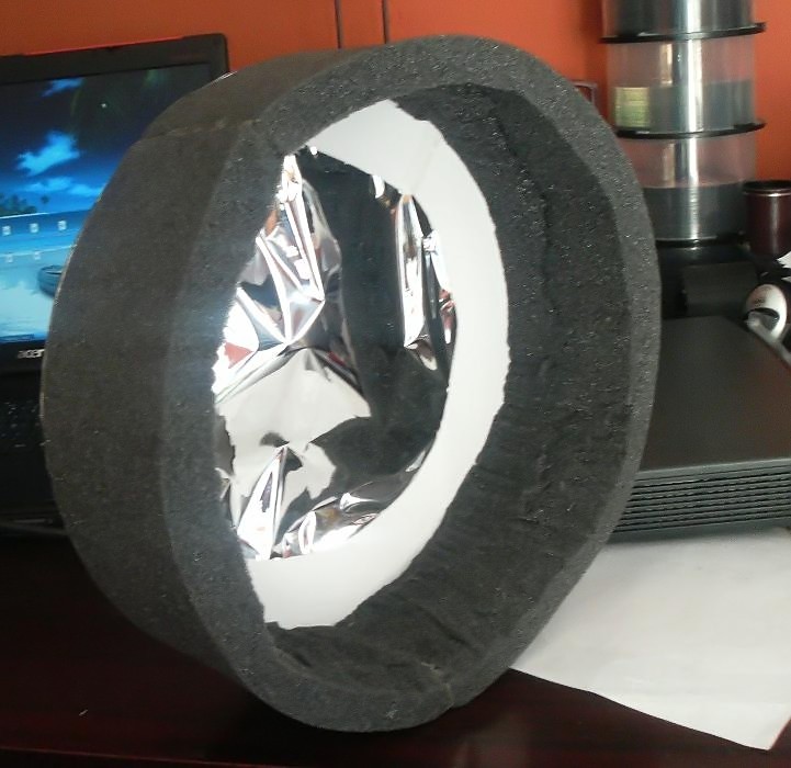 Καθώς οι νύχτες στη Θεσσαλονίκη τις τελευταίες ημέρες ήταν..επίμονα συννεφιασμένες, ο καιρός ήταν τέλειος για μια ακόμη πτυχή του χόμπυ μας: Τα μαστορέματα. Σκοπός η κατασκευή φίλτρου ηλίου από το γνωστό Astrosolar της Βaader, για το 8 ιντσων SCT μου, διαφορετική από τις λύσεις που ως τώρα προτάθηκαν και υλοποιήθηκαν (με εξαιρετικά αποτελέσματα) από πολλούς. Ο λόγος είναι ότι οι λύσεις με χαρτόνια, πιάτα γλαστρών κτλ. μου προκαλούσαν το φόβο ότι μπορεί να έπεφταν από το τηλεσκόπιο, με τρομακτικά αποτελέσματα για τους οφθαλμούς μας. Έτσι επιστρατεύτηκε το γνωστό υλικό ρικοφον του οποίου η αφρώδης υφή εκτός από ελαστική έχει και μεγάλο συντελεστή τριβής. Kόπηκε σε μια λωρίδα πλάτους 9εκ. και πάχους 2εκ. Τα άκρα της κολλήθηκαν (με κόλλα-σιλικόνη), σχηματίζοντας δακτύλιο 25εκ. που μπαίνει στο τηλεσκόπιο ακριβώς. Η εσωτερική πλευρά της λωρίδας κόπηκε επίτηδες ανομοιόμορφα ώστε να έχει ακόμη περισσότερη τριβή κατά την εφαρμογή στο τηλεσκόπιο. Επειτα, σε χαρτόνι σχεδιάστηκε κύκλος για την εφαρμογή του Baader Astrosolar και το χαρτόνι εφαρμόστηκε με κόλλα επάνω στον δακτύλιο από ρικοφον. Το αποτέλεσμα εξαιρετικό καθώς η ελαστική αφρώδης υφη του ρικοφον "κολλά" στο τηλεσκόπιο και κρατά σταθερό το φίλτρο ηλίου.