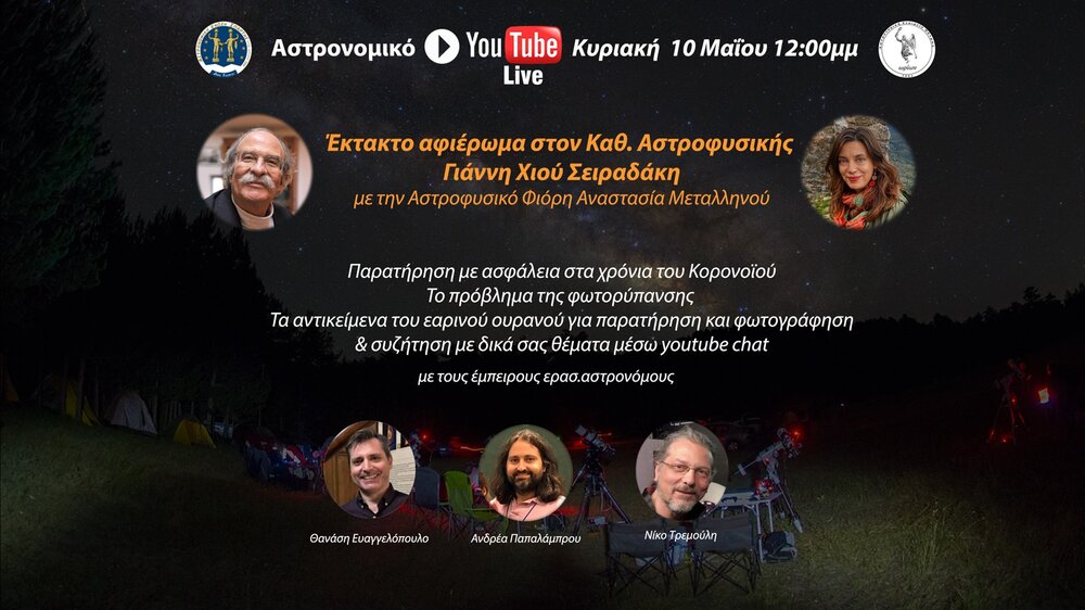 Σας υπενθυμίζουμε την αυριανή μας εκδήλωση ζωντανά από το Youtube στις 12:00 το μεσημέρι. Εκτάκτως πέρα της συζήτησης για την παρατηρησιακη αστρονομία θα γίνει και ένα αφιέρωμα στον αγαπημένο μας Αστροφυσικό καθηγητή Γιάννη Σειραδάκη που πρόσφατα ξεκίνησε το ταξίδι για τα άστρα που τόσο αγάπησε ! -