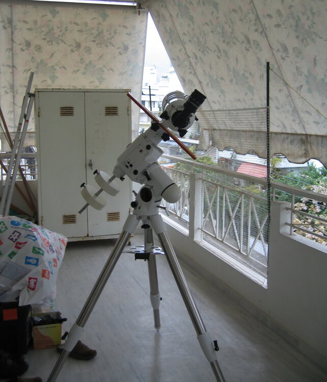 Λοιπον παδια βρηκα τη λυση Δυσκολα παει νους σου σε κατι τετοιο και ομως συνεβει!!!!!!!!! Για ολα φταινε τα προστατευτικα πλεγματα για τα παιδια. Δειτε παρακατω τις εικονες. Ολες ειναι κροπαρισμενες .[/img] Ελα ντε που το VIXEN ηρθε και στοχευε μεσα απο το πλεγμα. και το ED80 Χωρις εμποδιο. Η μπαρα της στηριξης ηταν στο ιδιο επιπεδο με το πανω μερος του πλεγματος. Σηκωνοντας τον τριποδα 25 τοτε ολα ηρθαν πανω απ το πλεγμα Εδω εχω ανεβασει τα ποδια του τριποδα 25cm περιπου (χθες ηταν τελειως κατω) Στη μπαρα ειχα και τα 2 τηλεσκοπια αριστερα το ED80 και δεξια το VIXEN . και καθως το γυρισα στο στοχο (βλεπετε στο βαθος ) ηρθε το ED80 επανω και το VIXEN κατω. Ελα ντε που ηρ Παιδια αυτο φταιει μη βαρατε Καιρος: εβρεχε και γω τραβουσα φωτο Kαμμια σχεση με τις χθεσινες και χωρις χρωμα ετσι? στα 20mm χωρις barlow. 40x Εδω στα 12mm περιπου 66χ -