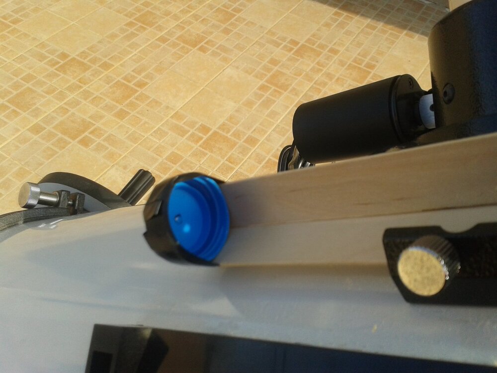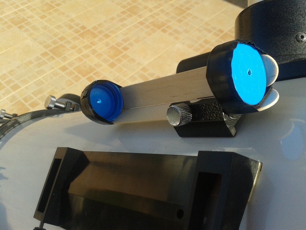 Μιας και πλησιάζει η διάβαση του Ερμή έφτιαξα εναν ηλιακο ερευνητη για εύκολο εντοπισμο του Ήλιου. Θα χρειαστείτε δυο πλαστικά καπάκια από μπουκάλι εμφιαλομένου νερού, δυο γλωσσοπίεστρα (θα τα βρείτε σε φαρμακείο) ή ξυλάκια από παγωτό και μονωτική ταινία ή σελοτέιπ. Πρώτα θα κάνετε μια τρυπα στο κέντρο απο το ενα καπακι. Σε αυτό θα βοηθήσει εαν το πλαστικό καπάκι από την μια πλευρα έχει βυθισμα ή καρούμπαλο, η τρύπα καλό ειναι να έχει το μέγεθος αυτού του σημειου στο καπάκι. Κολλήστε με την ταινία τα γλωσσοπίεστρα στο καπάκι έτσι ώστε να σχηματίζουν ενα ν και στο άλλο άκρο κολλήστε το άλλο καπάκι χωρίς να το τρυπήσετε, δεν χρειάζετε μεγάλη πίεση κατα το δέσιμο για να μην παραμορφωθεί το καπάκι. Για να χρησιμοποιήσετε την κατασκευή αυτή τοποθετήστε τον ερευνητη στο τηλεσκόπιο σας. Στο δικό μου το έβαλα στην βαση του ερευνητη με το τρύπιο καπάκι να βλέπει το άκρο του σωλήνα. Στην συνέχεια στρέψτε το τηλεσκόπιο έτσι ώστε το φως που περνάει απο το τρύπιο καπάκι να έρθει στο κέντρο από το δεύτερο καπάκι. Στην συνέχεια με ενα προσοφθάλμιο μικρής μεγέθυνσης κεντράρετε τον ήλιο στο πεδίο σας. Για όσους έχουν ισημερινή αυτόματη βάση τοποθετήστε τον ερευνητή στην σέλα της βάσης με τέτοιο τρόπο ώστε το ενα γλωσσοπίεστρο να εφάπτεται με ενα ίσιο μέρος από την σέλα της βάσης χωρίς εξοπλισμό ή αντίβαρα. Στην συνέχεια δώστε εντολη στην βάση να παέι στον ήλιο και μετα ρυθμίζοντας το αζιμούθιο και το ύψος της βάσης θα έχετε κάνει μια χονδρική πολική ευθυγράμμιση η οποία θα ακολουθεί τον Ήλιο χωρίς πολλές ρυθμίσεις μετά Το τηλεσκόπιο δεν βλέπει τον Ήλιο μιας και το φως που περνάει δεν είναι κεντραρισμένο στο καπάκι προβολής Ο ερευνητής τοποθετημένος στην βάση του τηλεσκοπίου. Το τηλεσκόπιο βλέπει τον Ήλιο μιας και το φως που περνάει είναι κεντραρισμένο στο καπάκι προβολής