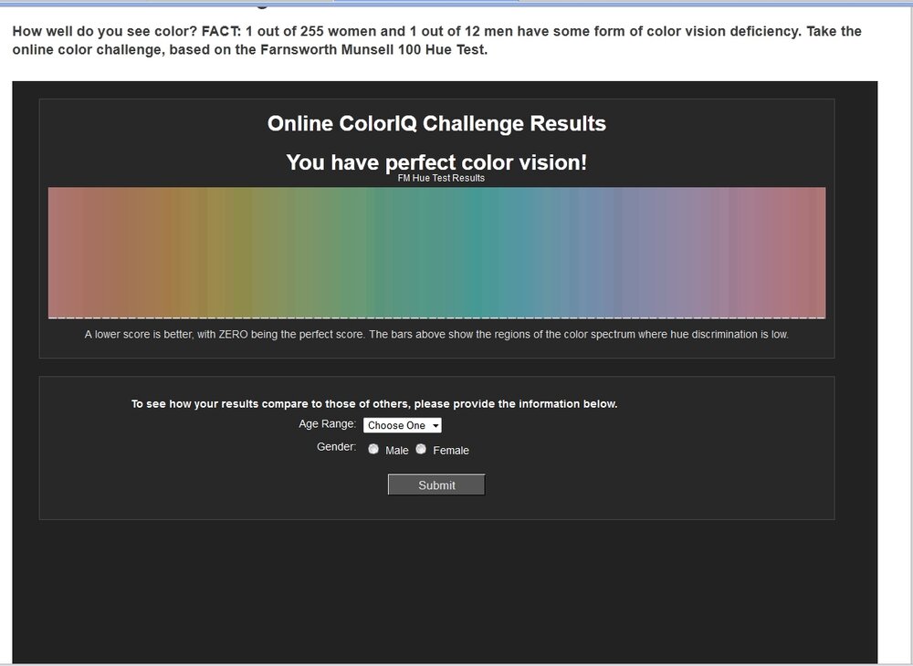 4. Μηδέν στο σκορ και μου φάνηκε σχετικά εύκολο! Πιστεύω και εγώ ότι η ενασχόληση με χρώματα, τέχνη, υπολογιστή με βοήθησε πολύ. Υποθέτω ότι κάποιος που δεν έχει ασχοληθεί με την διαφορά στους χρωματικούς τόνους, θα δυσκολευτεί περισσότερο, ακόμη και αν δεν έχει πρόβλημα.