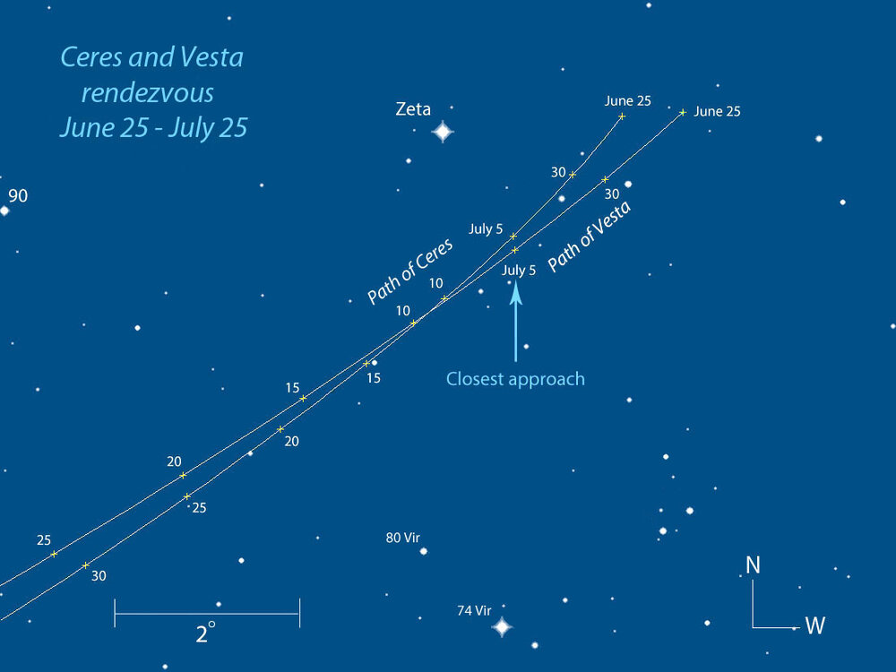 Το φαινόμενο είναι πραγματικά πολύ ενδιαφέρον και μπορεί να γίνει ακόμη περισσότερο αν αποτυπώνεται η καθημερινή παρατήρηση τους με ένα πρόχειρο σκαρίφημα. Έτσι θα φανεί η κίνηση που έχουν τα δύο σώματα, σε σχέση με τα άστρα που βρίσκονται στο πεδίο. Αν δεν το έχετε επιχειρήσει μέχρι τώρα, αξίζει να το δοκιμάσετε, είναι απολαυστικό! Αν ψάχνετε για ένα διάλειμμα τα επόμενα βράδια, βγείτε έξω με χαρτί και μολύβι. Η Σελήνη παρά το ότι είναι κοντά, δεν εμποδίζει στο να φανούν εύκολα τα αντικείμενα. Ο ουρανός σε εκείνο το σημείο είναι SQM 17.1 (περίπου 3 mag) αυτές τις ημέρες και τα αντικείμενα είναι ορατά ακόμη και με τα TS 10Χ50 κιάλια μου. Λίγη υπομονή μόνο χρειάστηκε για να εμφανιστεί η Δήμητρα. Ο χάρτης δείχνει την καθημερινή κίνηση των σωμάτων. πηγή: digitallearningfoundation.org -