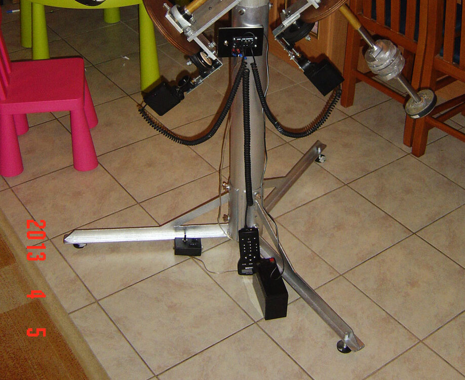 Μπορεί να χρησιμοποιηθεί και μοτέρ συνεχούς ρεύματος αντί για stepper motor, και ένα έτοιμο κύκλωμα ελέγχου ταχύτητας, για περισσότερη απλότητα. Εγώ χρησιμοποίησα ένα stepper motor και ένα κύκλωμα ελέγχου που είχα φτιάξει παλιότερα, το οποίο όμως είναι τόσο πολύπλοκο που δεν θα το επιχειρούσα ξανά, από τη στιγμή που μπορείς να βρεις κάτι έτοιμο και πάμφθηνο στο ebay. Ο ελεγκτής έχει τη δυνατότητα να αλλάζει τη φορά περιστροφής του μοτέρ και να αυξομειώνει την ταχύτητα με ένα ροοστάτη.