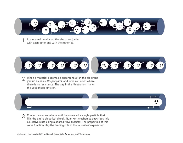 Βραβείο Νόμπελ Φυσικής 2025. Το βραβείο Νόμπελ 2025 στην Φυσική απονεμήθηκε στους John Clarke, Michel H. Devoret και John M. Martinis «για την ανακάλυψη του μακροσκοπικού φαινομένου κβαντομηχανικής σήραγγας (macroscopic quantum tunnelling) και της κβάντωσης ενέργειας σε ένα ηλεκτρικό κύκλωμα»Οι βραβευθέντες χρησιμοποίησαν μια σειρά πειραμάτων για να δείξουν ότι οι παράξενες ιδιότητες του κβαντικού κόσμου μπορούν να εκδηλωθούν σε μακροσκοπικά συστήματα. Το ηλεκτρικό ρεύμα (χιλιάδων ή εκατομμυρίων ηλεκτρονίων) μπορεί να διαπερνά φράγματα δυναμικού με τρόπο που δεν επιτρέπεται κλασσικά, παρόμοια με το γνωστό κβαντομηχανικό φαινόμενο σήραγγας. Έδειξαν επίσης ότι αυτά τα μακροσκοπικά συστήματα απορροφούσαν και απέδιδαν την ενέργεια κβαντισμένα. όπως προβλέπει η κβαντομηχανική για τα άτομα. Τα πειράματά τους σε ένα τσιπ αποκάλυψαν την κβαντική φυσική σε δράση Ένα βασικό ερώτημα στη φυσική είναι το μέγιστο μέγεθος ενός συστήματος που μπορεί να εμφανίσει κβαντομηχανικά φαινόμενα. Οι βραβευθέντες με το Νόμπελ Φυσικής 2025, διεξήγαγαν πειράματα με ένα ηλεκτρικό κύκλωμα στα οποία επέδειξαν τόσο το κβαντομηχανικό φαινόμενο σήραγγας όσο και την κβάντωσης της ενέργειας σε ένα αρκετά μεγάλο και χειροπιαστό σύστημα.Η κβαντομηχανική επιτρέπει σε ένα σωματίδιο να κινείται κατευθείαν μέσα από ένα φράγμα, διαμέσου του φαινομένου σήραγγας. Όταν όμως εμπλέκεται μεγάλος αριθμός σωματιδίων, τα κβαντομηχανικά φαινόμενα συνήθως γίνονται αμελητέα. Τα πειράματα των βραβευμένων απέδειξαν ότι οι κβαντομηχανικές ιδιότητες μπορούν να εκδηλωθούν σε μακροσκοπική κλίμακα. Το 1984 και το 1985, οι John Clarke , Michel H. Devoret και John M. Martinis διεξήγαγαν μια σειρά πειραμάτων με ένα ηλεκτρονικό κύκλωμα κατασκευασμένο από υπεραγωγούς, οι οποίοι άγουν το ρεύμα χωρίς να εμφανίζουν ηλεκτρική αντίσταση. Στο κύκλωμα, τα υπεραγώγιμα στοιχεία διαχωρίζονταν από ένα λεπτό στρώμα μονωτικού υλικού, μια διάταξη γνωστή ως επαφή Josephson. Βελτιώνοντας και μετρώντας τις διάφορες ιδιότητες του κυκλώματός τους, κατάφεραν να ελέγξουν και να εξερευνήσουν τα φαινόμενα που προέκυπταν όταν διοχέτευαν ρεύμα σε αυτό. Συνολικά, τα φορτισμένα σωματίδια που κινούνταν στον υπεραγωγό αποτελούσαν ένα σύστημα που συμπεριφερόταν σαν να ήταν ένα ενιαίο σωματίδιο που καταλάμβανε ολόκληρο το κύκλωμα.Αυτό το μακροσκοπικό- σαν σωματίδιο – σύστημα βρίσκεται αρχικά σε μια κατάσταση στην οποία το ρεύμα ρέει χωρίς τάση. Το σύστημα είναι παγιδευμένο σ’ αυτήν την κατάσταση, σαν να βρίσκεται πίσω από ένα εμπόδιο που δεν μπορεί να διασχίσει. Στο πείραμα, το σύστημα δείχνει τον κβαντικό του χαρακτήρα καταφέρνοντας να ξεφύγει από την κατάσταση μηδενικής τάσης μέσω σήραγγας. Η αλλαγή της κατάστασής του ανιχνεύεται μέσω της εμφάνισης μιας τάσης.Οι βραβευθέντες κατάφεραν επίσης να αποδείξουν ότι το σύστημα συμπεριφέρεται με τον τρόπο που προβλέπεται από την κβαντομηχανική – είναι κβαντισμένο, που σημαίνει ότι απορροφά ή εκπέμπει μόνο συγκεκριμένα ποσά ενέργειας.«Είναι υπέροχο που μπορούμε να γιορτάσουμε το γεγονός ότι η κβαντομηχανική, παρότι συμπληρώνει έναν αιώνα, συνεχίζει να μας εκπλήσσει. Είναι επίσης εξαιρετικά χρήσιμη, δεδομένου ότι αποτελεί τη βάση κάθε ψηφιακής τεχνολογίας», δήλωσε ο Olle Eriksson, Πρόεδρος της Επιτροπής Νόμπελ Φυσικής.Τα τρανζίστορ στα μικροτσίπ υπολογιστών είναι ένα παράδειγμα της καθιερωμένης κβαντικής τεχνολογίας που 
