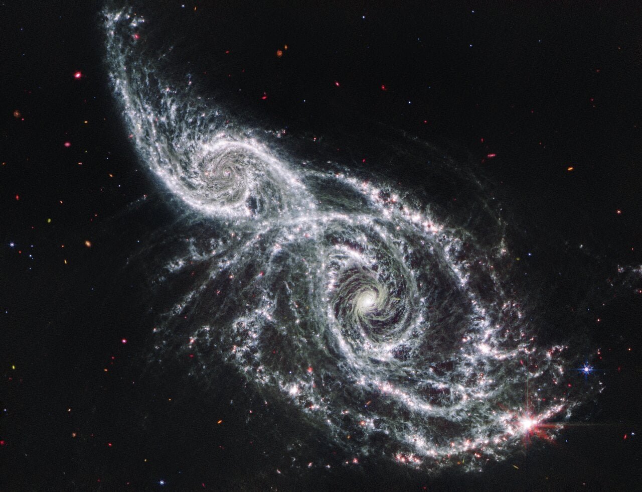 Ένα ιστό κοσμικού χάους στο Σύμπαν αποκαλύπτουν διαστημικά τηλεσκόπια Εντυπωσιακές εικόνες από τη συγχώνευση δύο γαλαξιών η οποία παράγει διάφορα φαινόμενα. Ένα εντυπωσιακό πορτρέτο δύο συγκρουόμενων σπειροειδών γαλαξιών συνδυάζει διαφορετικά είδη φωτός για να αποδώσει τα χρώματα, τα σχήματα και διαφόρων ειδών φαινόμενα που αποτυπώνονται ως ένα χαοτικό διαστημικό περιβάλλον.Η εικόνα, που δείχνει τους γαλαξίες NGC 2207 κάτω δεξιά και IC 2163 πάνω αριστερά, δημιουργήθηκε με τον συνδυασμό υπέρυθρου φωτός που κατέγραψε το διαστημικό τηλεσκόπιο James Webb και ακτίνων Χ από το Αστεροσκοπείο Ακτίνων Χ Chandra.Οι NGC 2207 και IC 2163 είναι εγκλωβισμένοι σε μια αργή βαρυτική συγχώνευση που παρατηρείται κατά μέτωπο από το ηλιακό μας σύστημα. Ο μεγαλύτερος γαλαξίας, ο NGC 2207, κυριαρχεί στο πεδίο ενώ ο μικρότερος IC 2163 επικαλύπτει τις εξωτερικές του περιοχές. Η βαρυτική έλξη του κάθε γαλαξία παραμορφώνει τους σπειροειδείς βραχίονες του άλλου τεντώνοντας ρεύματα άστρων και αερίου και συμπιέζοντας αέριο και σκόνη με τρόπους που μπορούν να πυροδοτήσουν τον σχηματισμό νέων άστρων. Το αποτέλεσμα είναι ένα περίπλοκο πλέγμα χάους. Ένας από τους βασικούς στόχους του James Webb σύμφωνα με τη NASA, είναι να προσφέρει στους επιστήμονες μια καθαρή εικόνα των κέντρων συγχωνευόμενων γαλαξιών και έτσι να συμβάλει στη δημιουργία μιας νέας γενιάς μοντέλων που θα περιγράφουν το πώς οι γαλαξίες αλληλεπιδρούν και συγχωνεύονται. Οι NGC 2207 και IC 2163 αποτελούν ιδανικούς στόχους για αυτόν τον σκοπό.Στις εικόνες τα δεδομένα μέσου υπέρυθρου του James Webb εμφανίζονται σε λευκές, γκρι και κόκκινες αποχρώσεις και απεικονίζουν κυρίως τη σκόνη και το ψυχρότερο υλικό στους πυρήνες και τους σπειροειδείς βραχίονες των γαλαξιών. Τα δεδομένα ακτίνων Χ του Chandra εμφανίζονται με μπλε χρώμα και αναδεικνύουν περιοχές υψηλής ενέργειας των δύο γαλαξιών όπως διπλά συστήματα άστρων, τα απομεινάρια νεκρών άστρων και περιοχές όπου έχουν συμβεί εκρήξεις υπερκαινοφανών. Η εντυπωσιακή γαλαξιακή συγχώνευση https://www.naftemporiki.gr/techscience/2050415/ena-kosmiko-isto-chaoys-sto-sympan-apokalyptoyn-diastimika-tileskopia/