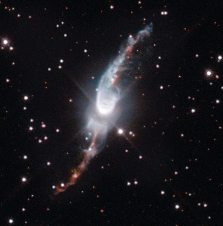 NGC 6543:Ένα άλλο πλανητικό νεφέλωμα καταγράφηκε με επιτυχία. Όπως γνωρίζουμε,ένα πλανητικό νεφέλωμα σχηματίζεται όταν ο αστέρας μετατρέπεται σε κόκκινο γίγαντα και αποβάλλει τα εξωτερικά αέρια του.Οι μελέτες σε 4 πλανητικά νεφελώματα καταγράφηκαν απ'το Hubble και απ'το Chandra στα φίλτρα κόκκινο,πράσινο,μπλε.Σύμφωνα με τελευταίες εκτιμήσεις,βρίσκονται σε απόσταση 5000 έτη φωτός μακριά απ'την Γη. Τα αποτελέσματα απ΄το Chandra δείχνουν πως τα ωστικά κύματα που προήλθαν απ'την <κατάρρευση> του αστεριού δημιούργησαν σοβαρά προβλήματα στην ατμόσφαιρα του. http://chandra.harvard.edu/photo/2012/pne/