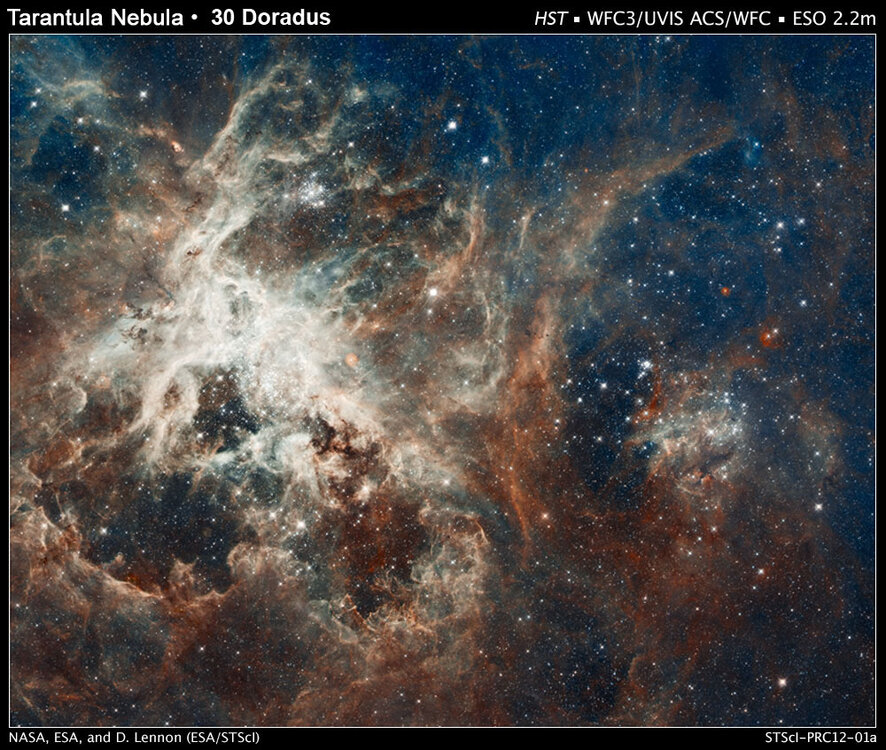Tarantula Nebula(30 Doradus):Μια διαφορετική άποψη για το νεφέλωμα αυτό. Μια νέα σύνθεση φωτογραφιών περιέχει το νεφέλωμα 30 Doradus.Η σύνθεση προήλθε από τα διαστημικά τηλεσκόπια Chandra,το Hubble,και Spitzer.Το νεφέλωμα λέγεται και "νεφέλωμα Ταραντούλα" και είναι μία από τις μεγαλύτερες περιοχές σχηματισμού άστρων που βρίσκονται κοντά στον Γαλαξία μας.Περιλαμβάνει χιλιάδες νέα αστέρια!!!!! http://chandra.harvard.edu/photo/2012/30dor/ http://www.nasa.gov/mission_pages/hubble/science/30doradus.html