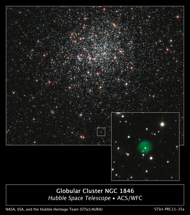 Η ζωή και ο θάνατος των αστεριών σε ένα σφαιρωτό σμήνος. Μια νέα εικόνα του Hubble δείχνει το όμορφο σφαιρικό σμήνος NGC 1846 στο εξωτερικό μέρος του Μεγάλου Νέφους του Μαγγελάνου.Εκεί,τα "γέρικα" αστέρια έχουν την έντονη απόχρωση του κόκκινου και τα πιο θερμά έχουν την έντονη γαλάζια απόχρωση.Στην παρακάτω εικόνα υπάρχουν γαλαξίες διάφορων μεγεθών και δομή.Βέβαια,το πιο ενδιαφέρον αντικείμενο δέν ανήκει στο συγκεκριμένο "σύμπλεγμα".Πρόκειται για ένα αχνό,πράσινο αντικείμενο κοντά στο κάτω μέρος της εικόνας.Πρόκειται για ένα πλανητικό νεφέλωμα,αποτέλεσμα του θανάτου ενός αστεριού.Είναι εντελώς αβέβαιο αν το συγκεκριμένο πλανητικό νεφέλωμα ανήκει στην "οικογένεια" του NGC 1846. http://www.nasa.gov/mission_pages/hubble/science/life-death.html