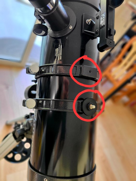 Καλησπέρα. Το συγκεκριμένο θέμα με είχε απασχολήσει κι εμένα προ ετών και η μόνη ουσιαστική λύση που βρήκα ήταν η χρήση ball-head. Ωστόσο, μπορείς για αρχή εσύ να χρησιμοποιήσεις τη βίδα με τη μαύρη ροδέλα που έφερε το δαχτυλίδι του τηλεσκοπίου σου κατά την αγορά του (αν δεν την έχεις χάσει κάπου)... Βίδωσε τη βίδα στο σπείρωμα του δαχτυλιδιού μέχρι τέρμα, και μετά κρατώντας κόντρα με το κατσαβίδι στη βίδα, βίδωσε από πάνω τη μαύρη ροδέλα. Κατόπιν, βίδωσε τη μηχανή σου. Αν είσαι εξαιρετικά τυχερός, η τελευταία θα τερματίσει περίπου ομοαξονικά με τον σωλήνα σου. Αν υπολείπονται μερικές μοίρες ακόμη, μπορείς να σφίξεις λίγο ακόμη τη μηχανή. Αν το σπείρωμα την μηχανής τερματίζει, αλλά ο άξονας της έχει ξεπεράσει για μερικές μοίρες αυτόν του σωλήνα, τότε μπορείς να ξεβιδώσεις ελαφρά τη βίδα από δαχτυλίδι και να την ξανασφίξεις έχοντας γυρίσει τη μηχανή προς την κατεύθυνση του σωλήνα. Το πρόβλημα υπάρχει όταν η βίδα έχει τέτοιο μήκος, ώστε όταν βιδωθεί η μηχανή μέχρι τέρμα παραμένει κενό μερικών χιλιοστών από το άνω μέρος της μαύρης ροδέλας μέχρι το κάτω μέρος της μηχανής. Σε αυτή την περίπτωση μπορείς να παρεμβάλεις μεταξύ τους απλές μεταλλικές ροδέλες από κατάστημα σιδηρικών και να σφίξεις το όλο σύστημα, ώστε να μη ξεβιδώνεται η μηχανή με το παραμικρό. Όπως και να χει το πράγμα όμως, πρέπει να έχεις το νου σου να μη ξεβιδωθεί η βίδα από το δαχτυλίδι, γιατί θα σου τρυπήσει το σωλήνα σου. Γι'αυτό κάθε φορά που θα γυρίζεις τη μαύρη ροδέλα ή τη μηχανή σου, πρέπει από κάτω να κρατάς κόντρα με το κατσαβίδι... Φιλικά, Κώστας... -