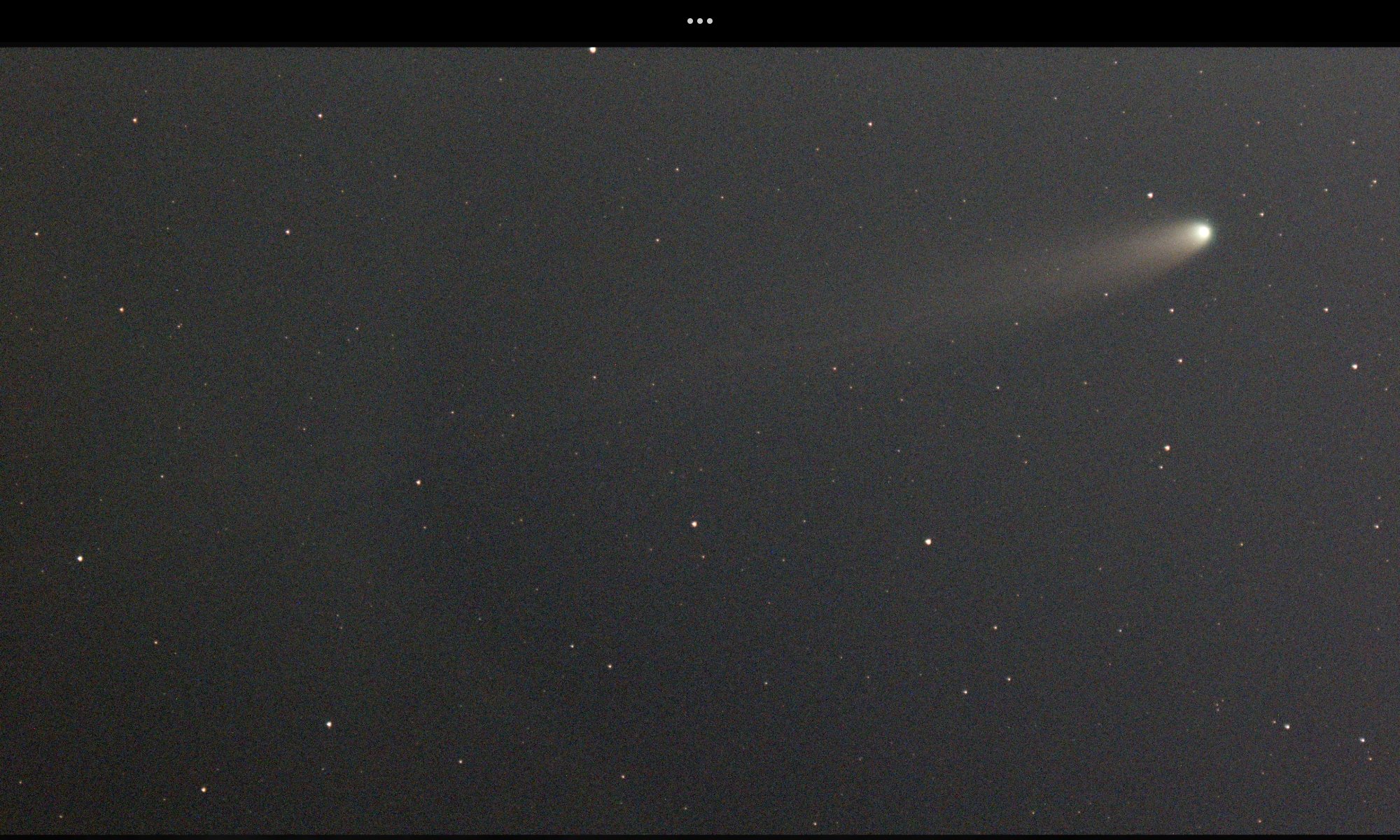Είναι η πρώτη μου φορά που με γυμνό οφθαλμό κατάφερα να δω κομήτη, και μάλιστα μέσα από αστική - ημιαστική περιοχή. Κατάφερα και τράβηξα μερικές φωτογραφίες, με τη βοήθεια του ASIAIR, με την asi485mc, κουμπωμένη σε έναν χαρισμένο παλιό ρώσικο helios 44m-4 58mm f2, που έδινε πεδίο λίγο παραπάνω από 10°,όσο δηλαδή είναι και το μήκος της ουράς του κομήτη. Τράβηξα καμιά 20αριά φώτο των 10 δευτερολέπτων, με ορθάνοιχτο διάφραγμα. Τα σύννεφα μου τα χάλασαν βέβαια, αλλά τότε ακριβώς ήταν που γύρισα το βλέμμα μου στον ουρανό και δεν πιστεύα στα μάτια μου :μια αραχνοΰφαντη μακρυά πινελιά με κλίση προς τα νότια, ορατή περισσότερο με πλάγια όραση, και όλο αυτό μέσα στη φωτορρύπανση της πόλης. Αυτή τη στιγμή δεν πρόκειται να την ξεχάσω ποτέ... -