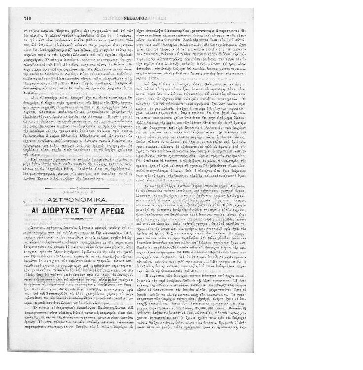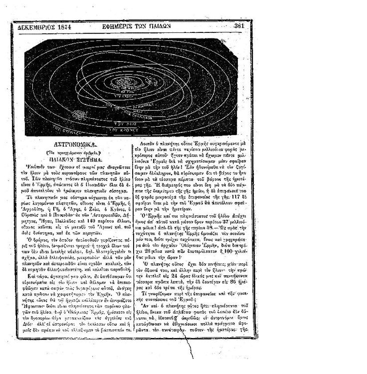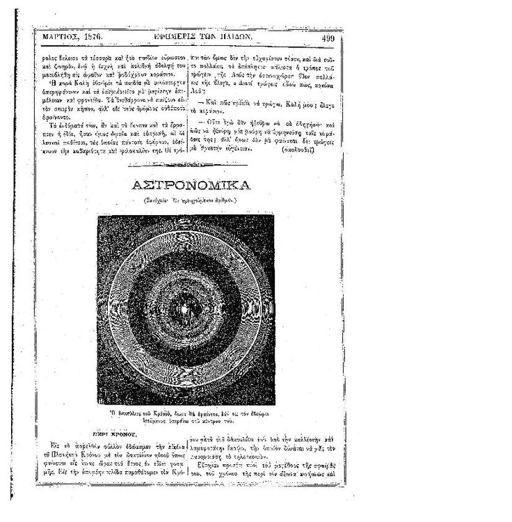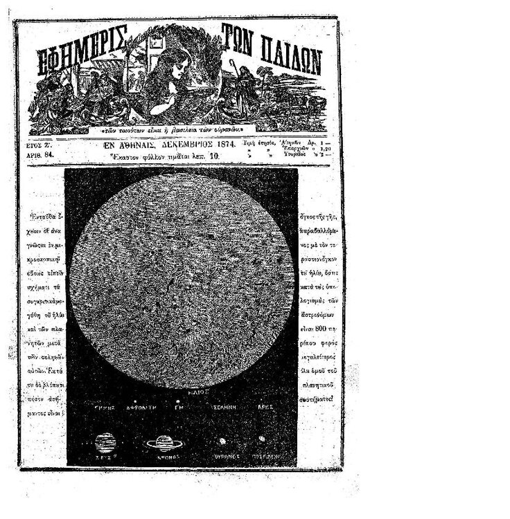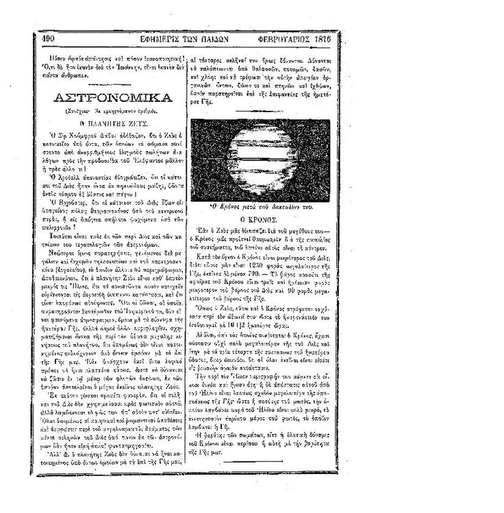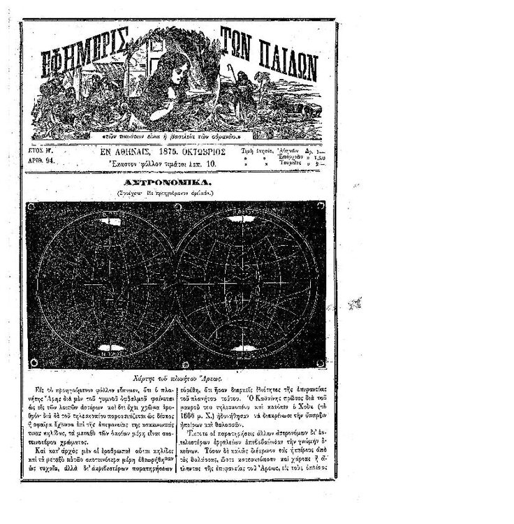 94. Ανώνυμου, «Αστρονομικά – Χάρτης του Πλανήτη Άρεως (συν. του προηγ.)», δημοσιεύθηκε στο περιοδικό «Εφημερίς των παίδων», Τ. 8, Τευχ. 94, 1875, σσ. 457-458. Σελίδα