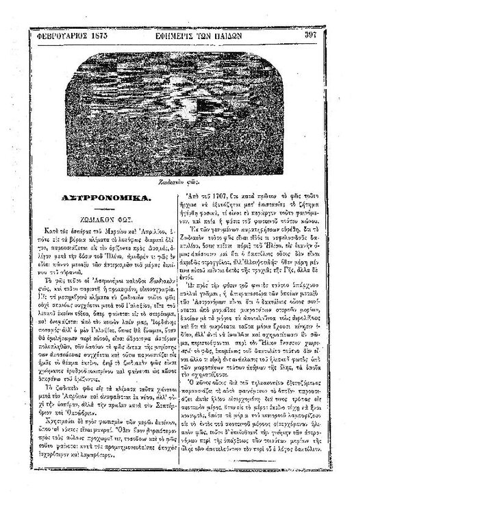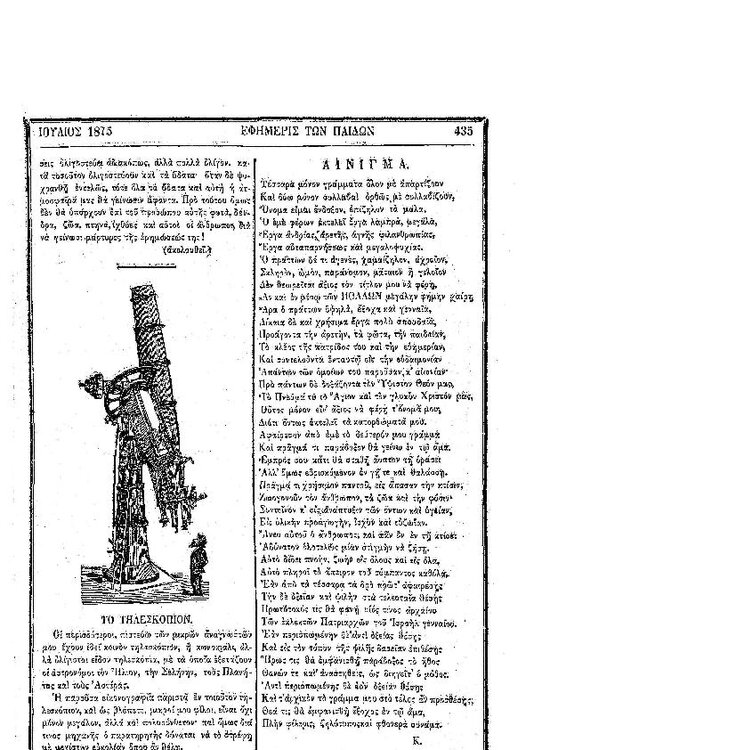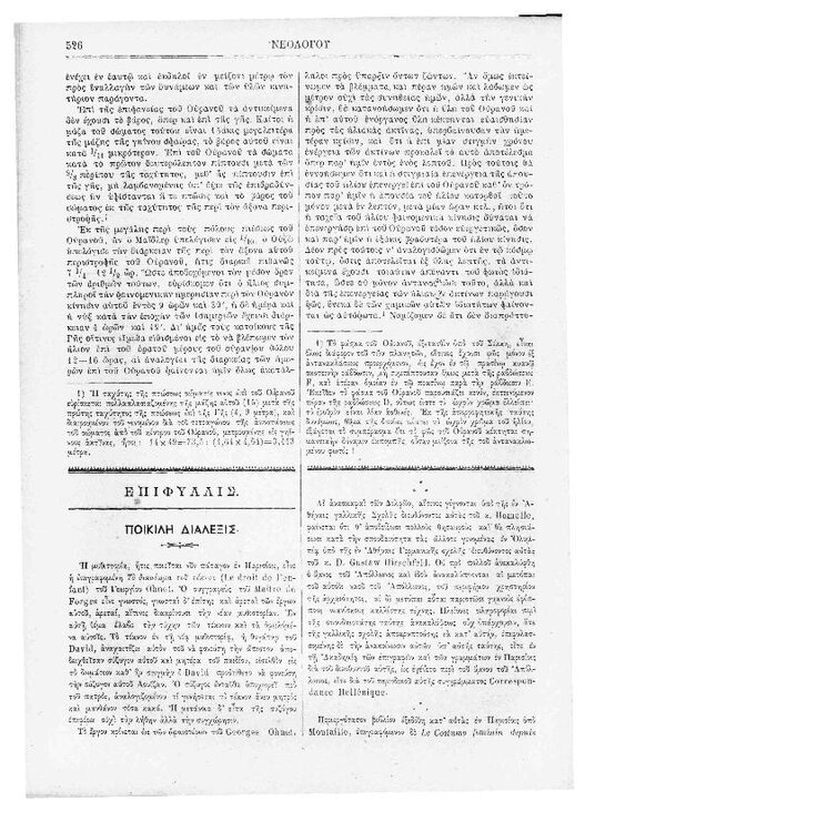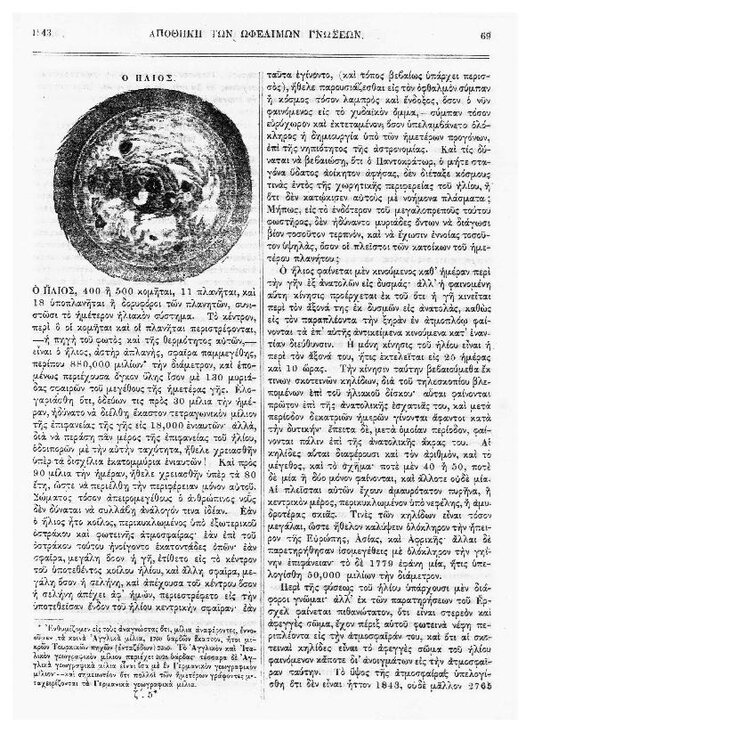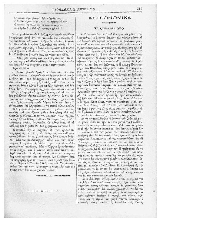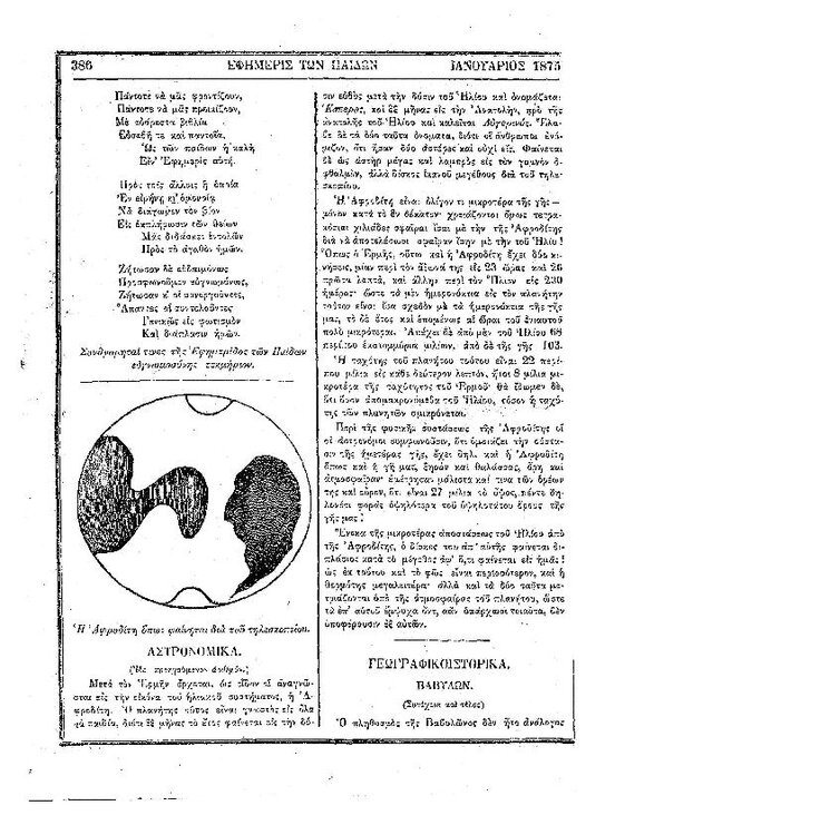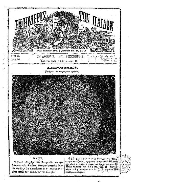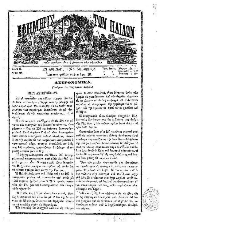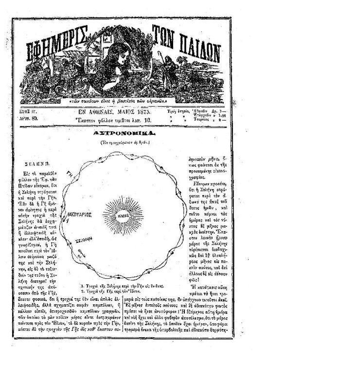 90. Ανώνυμου, «Αστρονομικά – φυσική σύστασις της Σελήνης», δημοσιεύθηκε στο περιοδικό «Εφημερίς των παίδων», Τ. 8, Τευχ. 90, το 1875, σσ. 425-426. Μια σελίδα