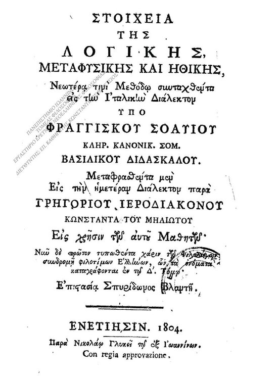 ΑΣΤΡΟΝΟΜΙΚΗ ΓΝΩΣΗ ΣΕ ΕΛΛΗΝΙΚΑ ΠΑΛΑΙΤΥΠΑ ΒΙΒΛΙΑMich απάντησε στην συζήτηση του/της Mich σε Αστρονομικές Εκδόσεις 45. Γρηγορίου Κωνσταντά Ιεροδ. εκ Μηλέας, «Στοιχεία της Λογικής, Μεταφυσικής και Ηθικής – (Ψυχολογίαν, Οντολογίαν, Κοσμολογίαν και Φυσικήν Θεολογίαν)», περιλαμβάνει ένα εκτενές κεφάλαιο με αναγραφές διαφόρων Κοσμολογικών Θεωριών και ένα κεφάλαιο με τις Αστρονομικές γνώσεις της εποχής, εκδόθηκε στη Βενετία το 1804. Σελίδα 2 Σελίδα 1 Tο εξώφυλο