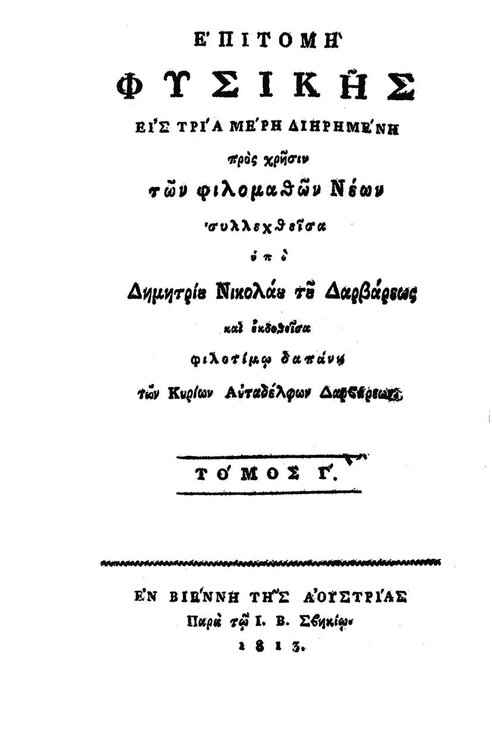 ΑΣΤΡΟΝΟΜΙΚΗ ΓΝΩΣΗ ΣΕ ΕΛΛΗΝΙΚΑ ΠΑΛΑΙΤΥΠΑ ΒΙΒΛΙΑMich απάντησε στην συζήτηση του/της Mich σε Αστρονομικές Εκδόσεις 35. Δάρβαρης Δημήτριος, «Επιτομή Φυσικής εις τρία μέρη διηρημένη προς χρήσιν των φιλομαθών νέων», Τόμος Γ΄, ουσιαστικά πρόκειται για έναν τόμο που κάνει μια εισαγωγή στη Γενική Αστρονομία, εκδόθηκε στη Βιέννη το 1813. Σχέδια Σελίδα 2 Σελίδα 1 Το εξώφυλο