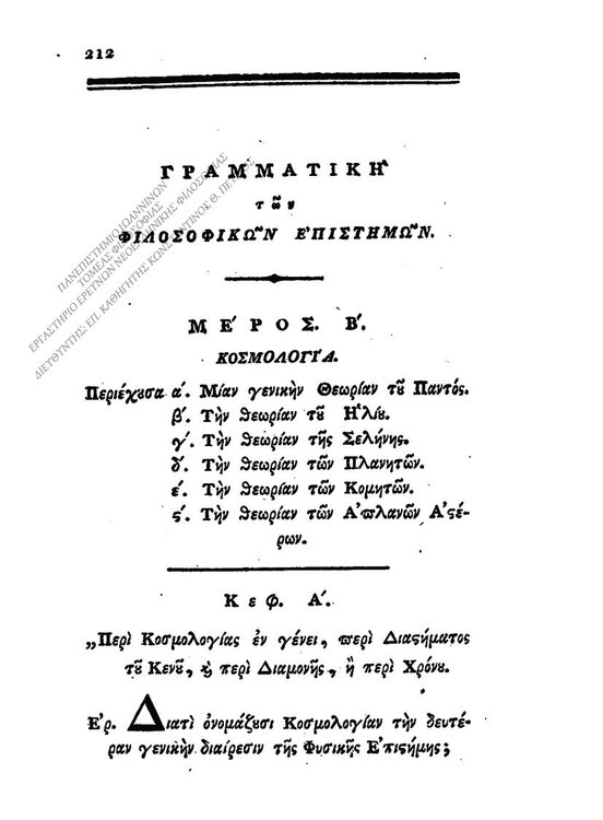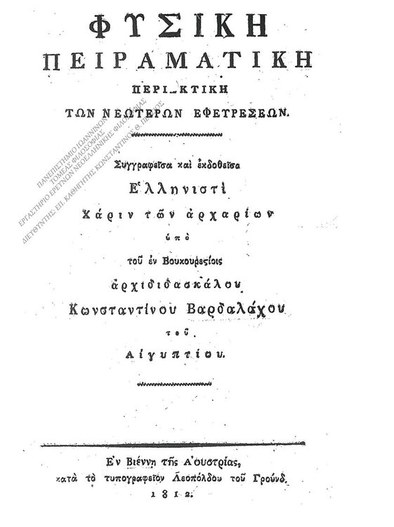 ΑΣΤΡΟΝΟΜΙΚΗ ΓΝΩΣΗ ΣΕ ΕΛΛΗΝΙΚΑ ΠΑΛΑΙΤΥΠΑ ΒΙΒΛΙΑMich απάντησε στην συζήτηση του/της Mich σε Αστρονομικές Εκδόσεις 32. Κωνσταντίνος Βαρδαλάχος, «Φυσική Πειραματική», περιλαμβάνει κεφάλαια για το Βόρειο Σέλας, για τα Μετέωρα, περί Οπτικής – κατοπτρικά και διοπτρικά, περί Αστρονομίας (εκλείψεων, πλανητών, Σελήνης, κομητών, σημειώνω επίσης ότι στις σσ 766-767 περιλαμβάνει κεφάλαιο με τίτλο : «περί των λεγόμενων κατοίκων των πλανητών»), εκδόθηκε στη Βιέννη το 1812. Σχέδιο2 Σχέδιο1 Σελίδα 2 Σελίδα 1 Το εξώφυλο