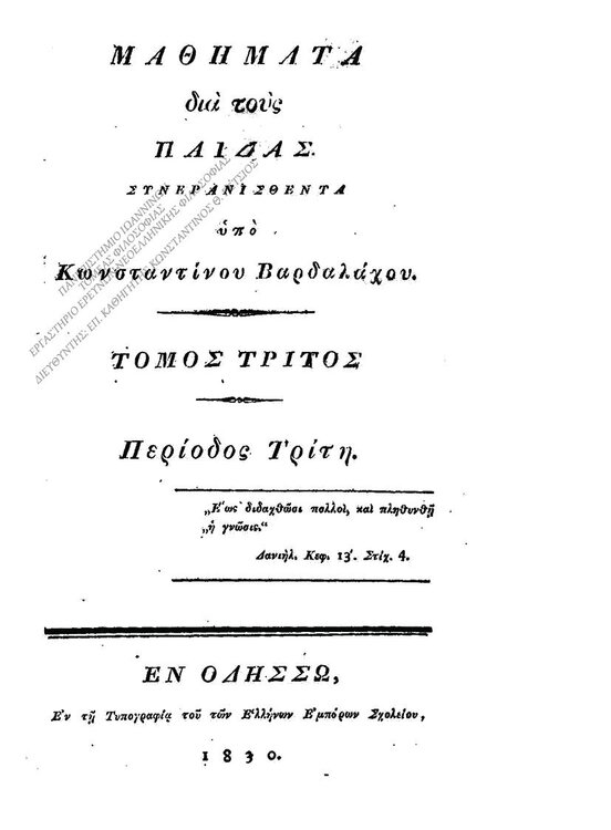 ΑΣΤΡΟΝΟΜΙΚΗ ΓΝΩΣΗ ΣΕ ΕΛΛΗΝΙΚΑ ΠΑΛΑΙΤΥΠΑ ΒΙΒΛΙΑMich απάντησε στην συζήτηση του/της Mich σε Αστρονομικές Εκδόσεις 31. Κωνσταντίνος Βαρδαλάχος, «Μαθήματα δια τους παίδας», τόμος Γ΄, και αυτό το έργο προορίζονταν για σχολική χρήση, περιέχει κεφάλαια περί της σφαίρας του παντός, περί Μετεώρων και διαττόντων αστέρων, εκδόθηκε στην Οδησσώ το 1830. Εξώφυλο