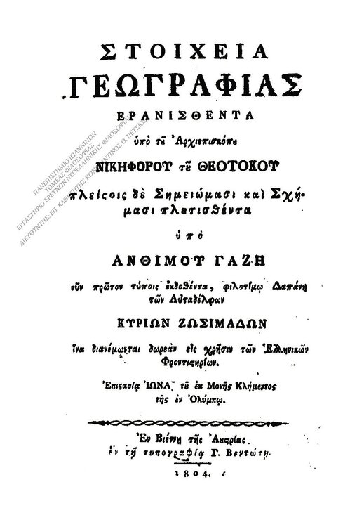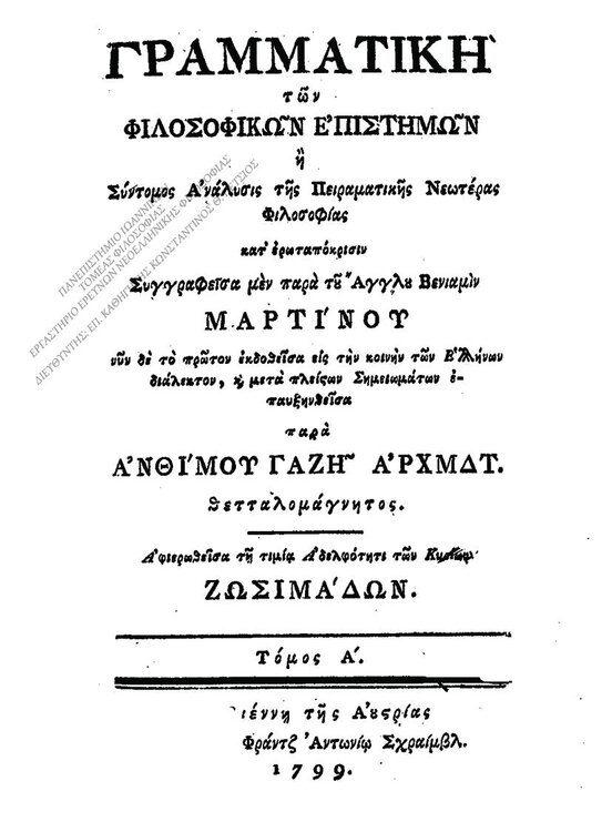 ΑΣΤΡΟΝΟΜΙΚΗ ΓΝΩΣΗ ΣΕ ΕΛΛΗΝΙΚΑ ΠΑΛΑΙΤΥΠΑ ΒΙΒΛΙΑMich απάντησε στην συζήτηση του/της Mich σε Αστρονομικές Εκδόσεις 41. ΄Ανθιμου Γαζή Αρχιμ. - μετάφραση, «Γραμματική των Φιλοσοφικών Επιστημών», Τόμος Α΄, το δεύτερο μέρος του έργου είναι Κοσμολογία με κεφάλαια για τους Πλανήτες, τη Σελήνη, τους Αστέρες, τους Κομήτες, τα Μετέωρα κλπ., εκδόθηκε στη Βιέννη το 1799. Πίνακας 4 Πίνακας 3 Πίνακας 2 Πίνακας 1 Μια σελίδα Eξώφυλο