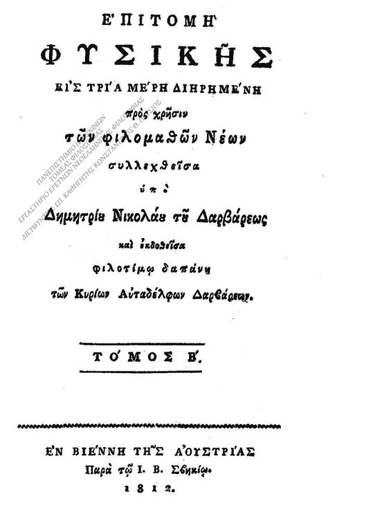 ΑΣΤΡΟΝΟΜΙΚΗ ΓΝΩΣΗ ΣΕ ΕΛΛΗΝΙΚΑ ΠΑΛΑΙΤΥΠΑ ΒΙΒΛΙΑMich απάντησε στην συζήτηση του/της Mich σε Αστρονομικές Εκδόσεις 34. Δάρβαρης Δημήτριος, «Επιτομή Φυσικής εις τρία μέρη διηρημένη προς χρήσιν των φιλομαθών νέων», Τόμος Β΄, περιέχει κεφάλαιο με τίτλο : «Καυστικά ένοπτρα και διοπτήρια, Μικροσκόπια & Τηλεσκόπια», εκδόθηκε στη Βιέννη το 1812. Μια σελίδα του βιβλίου Εξώφυλο