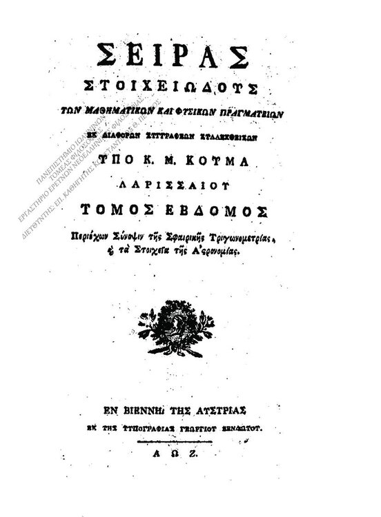 ΑΣΤΡΟΝΟΜΙΚΗ ΓΝΩΣΗ ΣΕ ΕΛΛΗΝΙΚΑ ΠΑΛΑΙΤΥΠΑ ΒΙΒΛΙΑMich απάντησε στην συζήτηση του/της Mich σε Αστρονομικές Εκδόσεις 38. Κούμας Κωνσταντίνος, «Σειράς στοιχειώδους των μαθηματικών και φυσικών πραγματειών» (7 τόμοι), Τόμος 7 – «Σύνοψιν της σφαιρικής Τριγωνομετρίας, και τα στοιχεία της Αστρονομίας», ουσιαστικά πρόκειται για μια εισαγωγή στην Αστρονομία, εκδόθηκε στη Βιέννη το 1807. Πίνακας 2 Πίνακας 1 Μια σελίδα Το εξώφυλο
