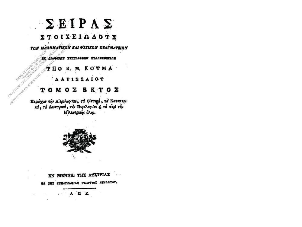 ΑΣΤΡΟΝΟΜΙΚΗ ΓΝΩΣΗ ΣΕ ΕΛΛΗΝΙΚΑ ΠΑΛΑΙΤΥΠΑ ΒΙΒΛΙΑMich απάντησε στην συζήτηση του/της Mich σε Αστρονομικές Εκδόσεις 23. Κούμας Κωνσταντίνος εκ Λαρίσης, «Σειράς στοιχειώδους των μαθηματικών και φυσικών πραγματειών» (7 τόμοι), τόμος 6, κεφάλαια για την Οπτική, τα κατοπτρικά και τα διοπτρικά, εκδόθηκε στη Βιέννη το 1807. Πίνακας 2 Πίνακας 1 Σελίδα 2 Σελίδα 1 Το εξώφυλο