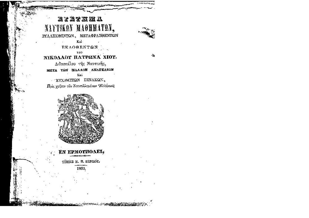 ΑΣΤΡΟΝΟΜΙΚΗ ΓΝΩΣΗ ΣΕ ΕΛΛΗΝΙΚΑ ΠΑΛΑΙΤΥΠΑ ΒΙΒΛΙΑMich απάντησε στην συζήτηση του/της Mich σε Αστρονομικές Εκδόσεις 25. Νικόλαου Πάτρωνα του Χίου, «Σύστημα Ναυτικών Μαθημάτων», εκδόθηκε στην Ερμούπολη το 1860 και ανάμεσα στα κεφάλαιά του περιλαμβάνονται και τα κάτωθι : περί Αστρονομικού χρόνου, η ετήσια κίνηση του Ήλιου, περί απλανών αστέρων, περί Πλανητών, περί Σελήνης και των φάσεών της, περί της θέσεως των αστέρων ως προς τον Ισημερινό, περί του Τηλεσκοπίου. Μια από τις σελίδες του βιβλίου Εξώφυλο