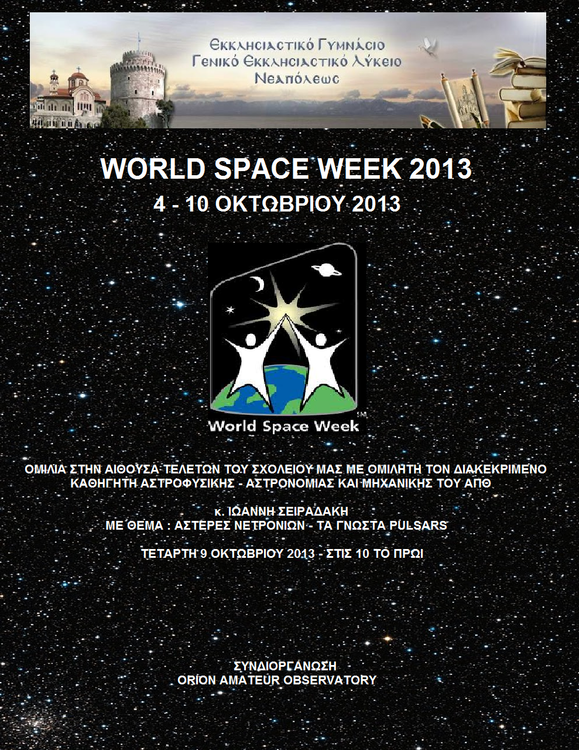 17. Στα πλαίσια της Παγκόσμιας Εβδομάδας Διαστήματος θα πραγματοποιηθεί την Τετάρτη στις 9 Οκτωβρίου 2013 ομιλία στην αίθουσα εκδηλώσεων του σχολείου μας, με ομιλητή το διακεκριμένο καθηγητή Αστροφυσικής - Αστρονομίας και Μηχανικής του ΑΠΘ κ. Ιωάννη Σειραδάκη με θέμα: «ΑΣΤΕΡΕΣ ΝΕΤΡΟΝΙΩΝ - ΤΑ ΓΝΩΣΤΑ PULSARS» http://www.worldspaceweek.org/wsw/index.php?option=com_content&view=article&catid=7:basics&id=91:eventdetails&Itemid=135&eventID=4416