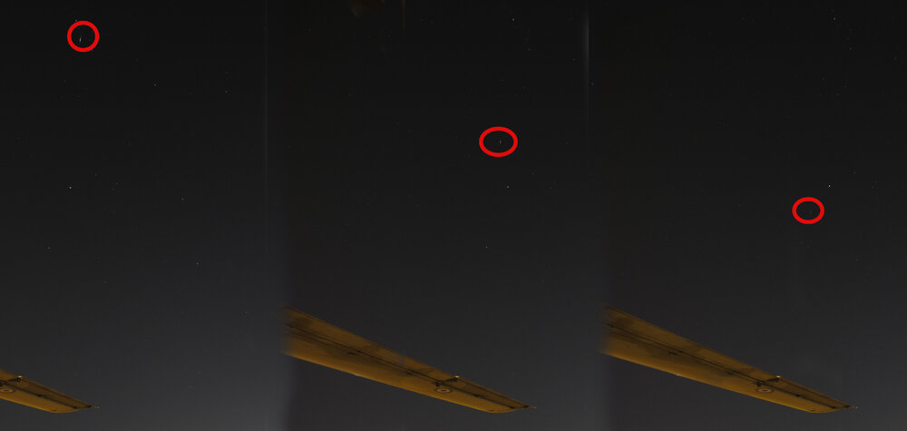 Πιθανών να έχουμε να κάνουμε με τον ίδιο δορυφόρο... Οι φωτογραφίες έχουν διάρκεια έκθεσης 15 sec και περίπου 30 sec διαφορά η μία από την άλλη και είναι κοντά στον αστερισμό της Κασσιόπης. Η πρώτη λήψη έγινε 04:32 και η τρίτη έγινε 04:34. Δεν τον παρατήρησα την ώρα που περνούσε αλλά από τις φωτογραφίες τις οποίες έχω σε καλύτερη ανάλυση μπορεσα να διακρίνω την μεταβλητότητα στη φωτεινότητα του καθώς και τη σχετικά αργή ταχύτητά του. Γνωρίζω το heavens-above δεν κατάφερα όμως να βρω πως μπορώ να αντρέξω σε παρελθοντικους χρόνους για να εντοπίσω ένα αντικείμενο. -