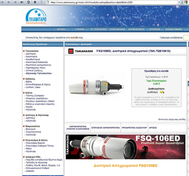 Θέλω να πάρω ένα τηλεσκοπιάκι για το μικρό μου γιο. Ποιο από τα δύο νομίζετε καλύτερο για ένα 7χρονο; Και η τιμή δεν είναι άσχημη, έτσι δεν είναι; Takahashi sky 90 Takahashi FSQ106 ED