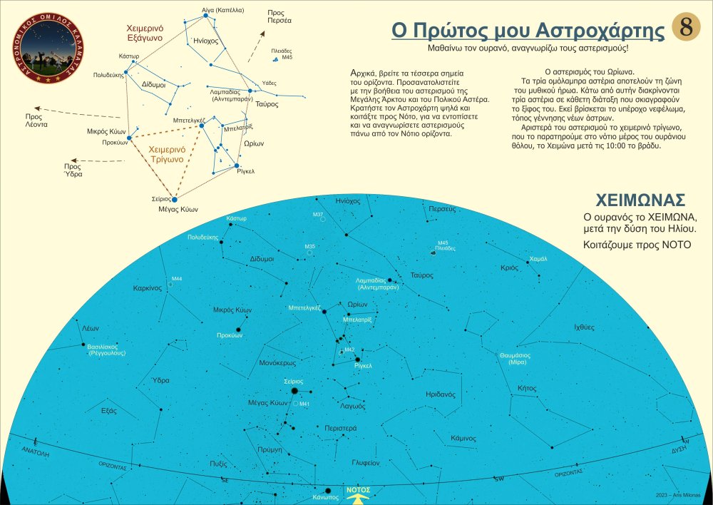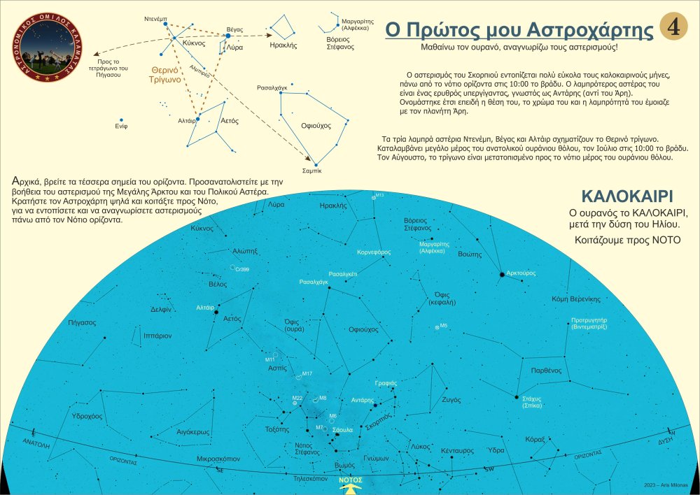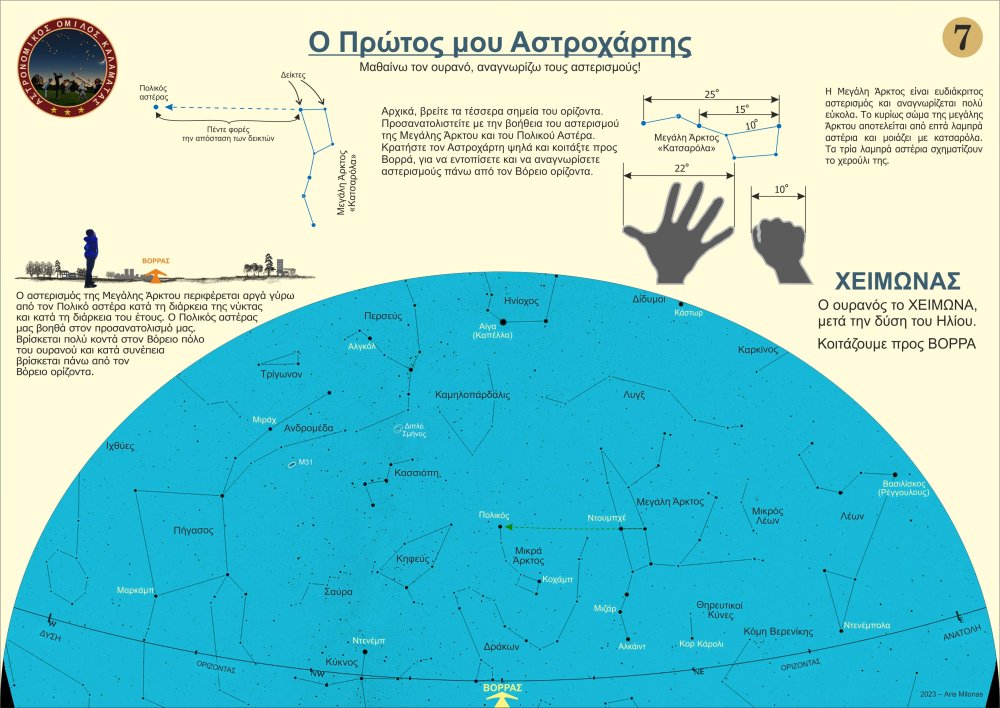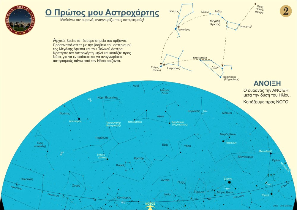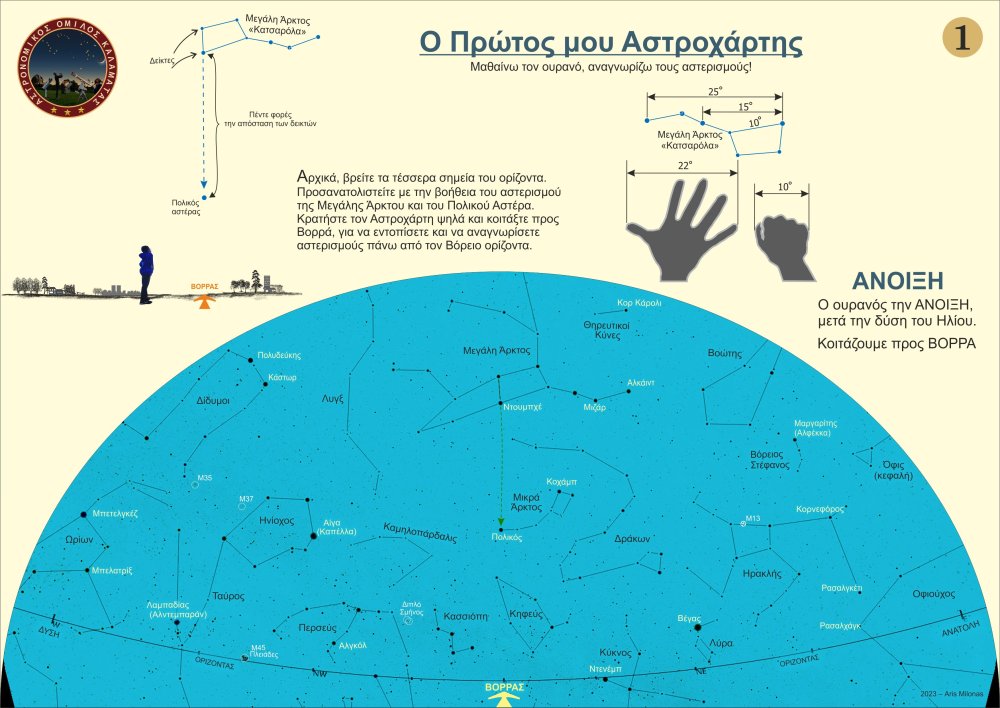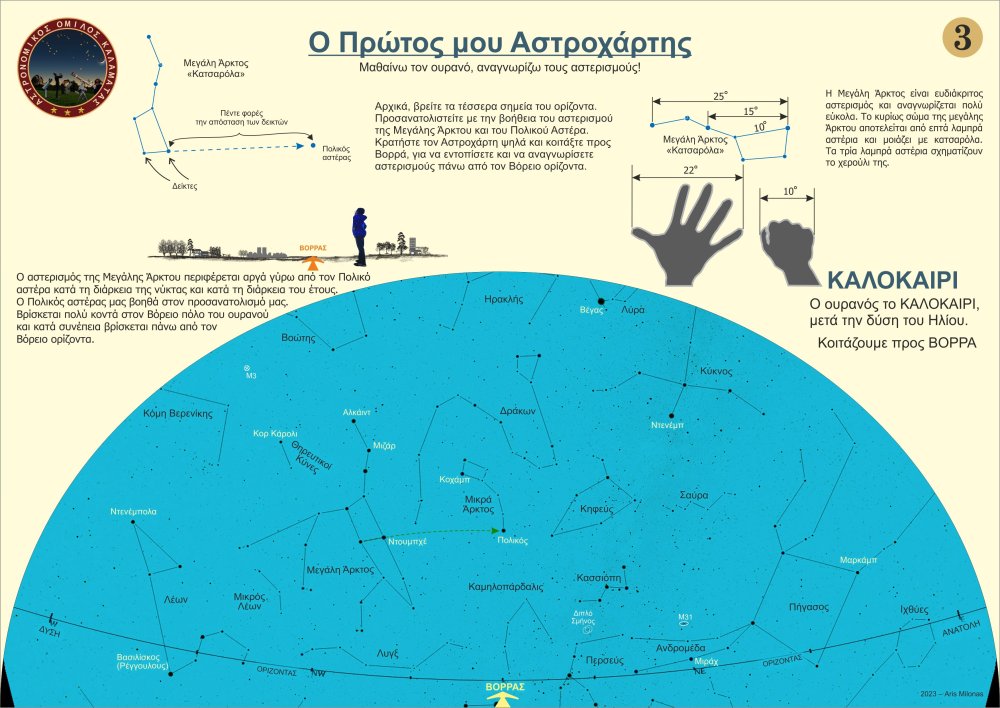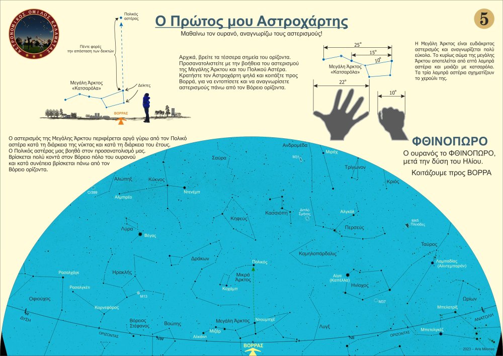 Σχεδίασα 8 απλούς βασικούς αστροχάρτες (2 ανά εποχή του χρόνου), που θα μπορούσε κάποιος αρχάριος να χρησιμοποιήσει, προκειμένου να μάθει γρήγορα τους βασικούς αστερισμούς και τους λαμπρούς αστέρες και να μάθει να προσανατολίζεται με την Μεγάλη Άρκτο και τον Πολικό Αστέρα. Μπορείτε ελεύθερα να τους τυπώσετε σε Α4, ή ακόμη καλύτερα σε Α3 (μπρος πίσω ανά εποχή) και να τους πλαστικοποιήσετε ώστε να προστατεύονται από την υγρασία. Καλές παρατηρήσεις. Άρης Μυλωνάς- 5 απαντήσεις