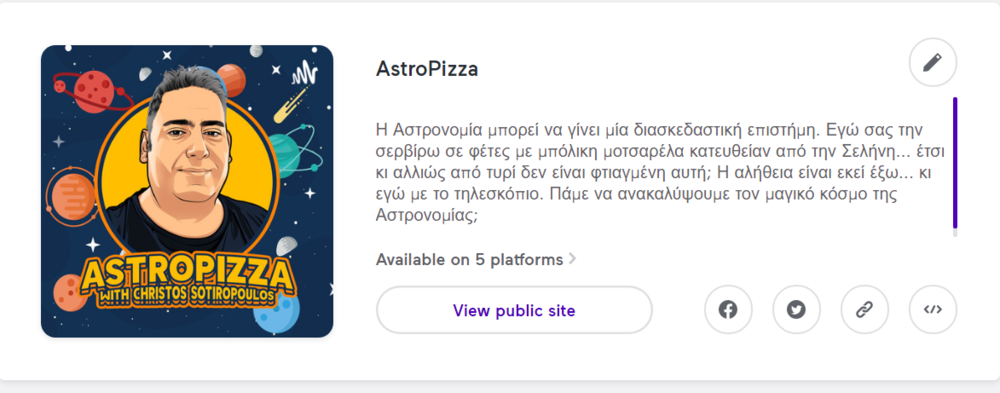 Γεια σας! Ξεκίνησα σήμερα ένα podcast με θέμα την Αστρονομία. Μπορείτε να βρείτε το σημερινό 1ο επεισόδιο εδώ: https://anchor.fm/christos-sotiropoulos/episodes/Astropizza-ep-1-ev5ais Φιλοξενείται στο Anchor.fm και είναι διαθέσιμο μέσω Spotify, Google podcast, RadioPublic kai Pocketcasts Περίληψη επεισοδίου: Από που να ξεκινήσει κανείς ένα podcast για την Αστρονομία... μάλλον από την αρχή! Σε αυτό το επεισόδιο: Τι είναι Αστρονόμος και ποια η διαφορά του από τον ερασιτέχνη αστρονόμο; Γιατί επιστρέφουμε στην Σελήνη μετά το 1972; Πόσο εύκολο είναι να πετάξει ένα ελικόπτερο στον Άρη; Αστροφιλοσοφικές ανησυχίες: Η Αναζήτηση της γνώσης Ευχαριστώ Astropizza η Αστρονομία σερβιρισμένη αλλιώς -