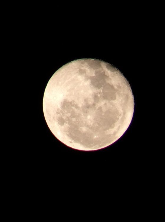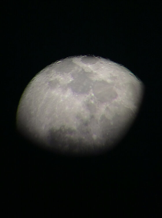 Παραθέτω τις ίδιες φώτο με μεγέθυνση για να τονιστεί το χρωματικό σφάλμα.Τονίζω ότι είναι extreme οι καταστάσεις για το τηλεσκόπιο, πολύ φωτεινό αντικείμενο (πανσέληνος), φτηνά προσοφθάλμια, διαγώνιο της πλάκας και φωτογραφίες τραβηγμένες από κινητό και μεγεθυμένες!! Με 2 λόγια: Είναι το χειρότερο που μπορεί να αποδώσει!!