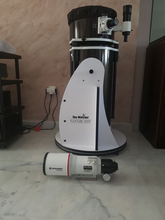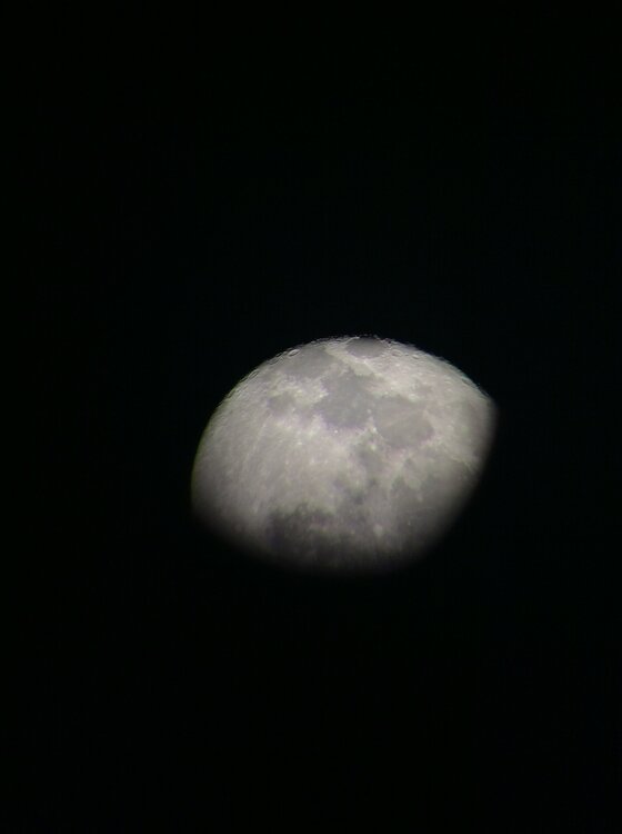 Το τηλεσκόπιο στήθηκε στη νεοαφιχθείσα EXOS-2 και έβγαλα 2 πρόχειρες φωτογραφίες της σελήνης για να δείτε την απόδοσή του. Οι φώτο τραβήχτηκαν με κινητό κατευθείαν από το προσοφθάλμιο και χρησιμοποιήθηκαν τα 25mm και 10mm της Skywatcher (ναι αυτά που δίνουν με τα διάφορα τηλεσκόπια) και το φτηνό πλαστικό διαγώνιο της BRESSER! Τα αποτελέσματα είναι εντυπωσιακά για ένα τόσο γρήγορο διοπτρικό. Περίμενα τρελά σφάλματα, ειδικά σε μεγαλύτερη μεγέθυνση και παρόλο που είμαι "καθρεφτάς" και πίστευα ότι θα με πειράζει το χρωματικό σφάλμα, αντιθέτως, το βρίσκω πολύ υποφερτό! Το μόνο πρόβλημα που αντιμετώπισα είναι ότι με το αντίβαρο της βάσης 4,5 κιλών, ήταν αδύνατο να ισορροπήσω τα 2,5 κιλά του τηλεσκοπίου, επομένως πρέπει να πάρω μικρότερο αντίβαρο.