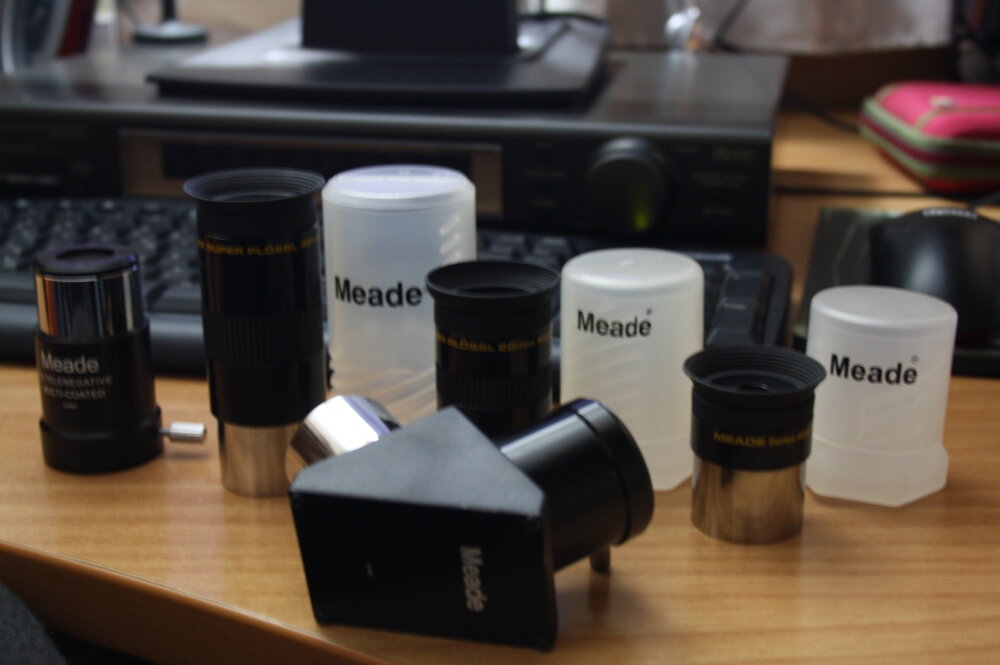 Πωλουνται αυτα τα εξαιρετικα προσοφθαλμια Super plossl series 4000 32mm,20mm,9.7mm στις θηκες τους , μαζι με το Barlow 3x και το διαγωνιο πρισμα 90 μοιρων 1,25",ολα της Meade,σε υπεραριστη κατασταση.Διδονται ολα μαζι σαν σετακι.Τιμη 125 ευρω συζητησιμα.Αλεκος Το σετακι