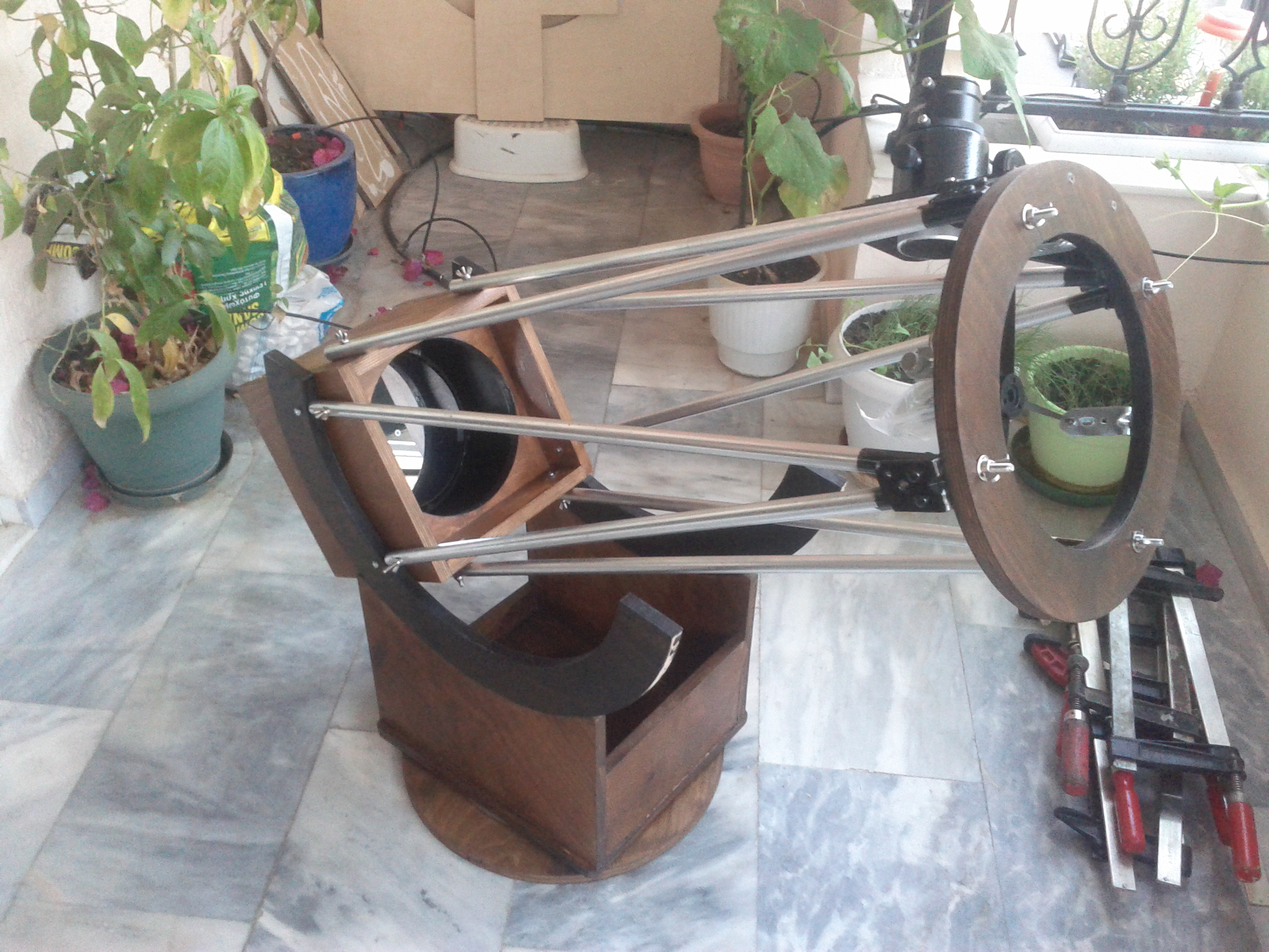 21. Καλημέρα σε όλους τους φίλους του astrovox , Σας παρουσιάζω παρακάτω την δική μου κατασκευή τηλεσκοπίου 8" f/5 με αντιστηρίγματα, που σκοπό είχε την απόκτηση ενός φορητού αλλά στιβαρού τηλεσκοπίου ταξιδίου με ικανοποιητική διάμετρο για βαθύ ουρανό και το πιο σημαντικό, την εκπαίδευση και της γνώσεις που αποκομίζεις από τα στάδια της όλης κατασκευής. Αν και δεν είχα στην κατοχή μου όλα τα εργαλεία που θα ήθελα, και ήταν απαραίτητα, το αποτέλεσμα με ικανοποίησε πλήρως και η αγάπη μου για αυτό το μικρό τηλεσκοπιάκη είναι πιο μεγάλη απ`ότι περίμενα ... Για την κατασκευή χρησιμοποιήθηκε κόντρα πλακέ θαλάσσης 18χιλ εσωτερικού χώρου σημύδας. Σωλήνες αλουμινίου 18χιλ, γωνιές γαλβανιζέ, ξυλόβιδες και βίδες με παξιμάδια ασφαλείας, βερνίκια νερού σατινέ (ματ), χερούλια μεταφοράς, ύφασμα φωτοχιτωνίου ... Τα κάτοπτρα ο εστιαστής και η αράχνη πάρθηκαν από έναν μεταχειρισμένο σωλήνα Skywatcher Astro 200 f/5 με το δευτερεύων διαγώνιο 2,7 ίντσες. Για την κίνηση χρησιμοποιήθηκε ή καταπληκτική Ebony Star - Wilsonart φορμάικα και ένα ρουλεμάν τύπου lazy-suzan που στο μέλλον θα αντικατασταθεί και αυτό από φορμάικα αφού δεν έχω βρει μέχρι στιγμής ικανοποιητικό τρόπο για να εφαρμόσω πάνω του κάποιο φρένο χωρίς όμως αυτό να εμποδίζει την παρατήρηση όταν το συνηθίσεις. Το βάρος του 18 κιλά. Η Ευθυγράμμιση στο λεπτό χρησιμοποιώντας tublug και άψογη κατά τις μετακινήσεις. Λόγω του υπερμεγέθους δευτερεύοντος σε σχέση με της ίντσες του πρωτεύοντος και το ιδανικό μέγεθος σε γρήγορα τηλεσκόπια, πειραματίστηκα στην ευθυγράμμιση offset οι οποία μας επιτρέπει τον πλήρη φωτισμό του δευτερεύοντος από άκρη σε άκρη με ένα μικρό μειονέκτημα στην πλανητική, διότι ή φωτεινότητα ενός πλανήτη φαίνεται ελαφρός εξασθενημένη στο κέντρο του πεδίου αλλά παραμένει ή ίδια μέχρι τις άκρες, σε αντίθεση με έναν μικρότερο δευτερεύων διαγώνιο και τοποθετημένο ακριβώς στο κέντρο ο οποίος είναι πολύ φωτεινός στο κέντρο και εξασθενεί στις άκρες. (καθαρά πλανητικό τηλεσκόπιο). Ένα άλλο μειονέκτημα στην μέθοδο αυτή είναι ότι λόγο τις μετατόπιση του δευτερεύοντος μακρυά από τον εστιαστή και προς το πρωτεύων , ο έλεγχος της ευθυγράμμισης με έναν cheshire είναι δύσκολος διότι δεν φαίνονται τα clips του πρωτεύοντος, συνηθισμένου σε αυτού του τύπου υπερμεγέθους δευτερεύων διαγώνιους σε πολλά βαθέως ουρανού γρήγορα τηλεσκόπια. Σε αυτήν την μέθοδο χρησίμευσε δραστικά το ολογραφικό πλέγμα του Howie Glatter. Και όλα τα παραπάνω όπως είπα στα πλαίσια του πειραματισμού αφού οι απόψεις διίστανται για το αν αξίζει τελικά... στην οπτική παρατήρηση. Το τηλεσκόπιο δοκιμάστηκε με όλα τα προσοφθάλμια τα οποία διέθετα barlow 2x + powermate 2,5x + Antares 1,6x 2" και βρέθηκε να λειτουργεί άψογα. Vixen LVW 3.5mm, 5mm, 8mm, 13mm, 17mm , 22mm, Televue Ethos 10mm,21mm, Televue Nagler 26mm T5, Vixen NLVW 30mm, Televue Panoptic 35mm, Vixen NLV 6mm ,Vixen NLV 7mm, University Optics Ortho 5mm Volcano top, Baader Ortho 6mm, 12,5mm, Vixen LV Zoom 8-24 mm Στο μόνο προσοφθάλμιο που αντιμετώπισα πρόβλημα είναι στον Vixen NLVW 30mm 2", ο οποίος για να εστιάσει χρειάζεται 1εκ ακόμη κόψιμο οι σωλήνες χωρίς να επηρεάζετε ή εστίαση όλων των άλλων προσοφθάλμιων. Σας παραθέτω παρακάτω φωτογραφίες από τα διάφορα στάδια της κατασκευής οι οποία κράτησε περίπου δύο μήνες. Η στεφάνη. - Πάνω μέρος Στεφάνη - Κόψιμο με ρούτερ Πρόχειρα μονταρισμένο κατασκευή του κυτίο πρωτεύοντος καθρέπτη κατασκευή του κυτίο πρωτεύοντος καθρέπτη κατασκευή του κυτίο πρωτεύοντος καθρέπτη
