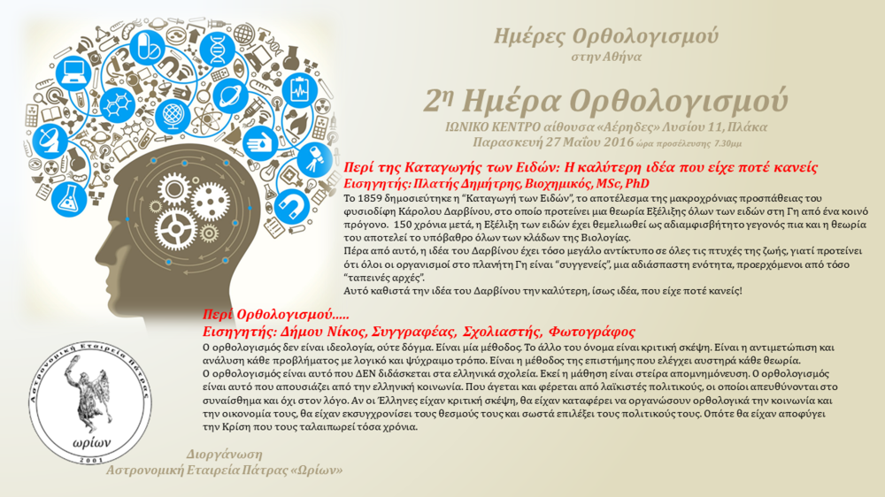 Καταλήγουν οι ημέρες Ορθολογισμού στην Αθήνα την Παρασκευή 27 Μαίου με δύο εξαιρετικές ομιλίες. Ο Δημήτρης Πλατής θα μας εισάγει στην Θεωρία της Εξέλιξης του Κάρολου Δαρβίνου και θα μας εξηγήσει γιατί η θεωρία αποτελεί πια αδιαμφισβήτητο γεγονός, ενώ ο Νίκος Δήμου θα συζητήσει με το κοινό και με τεκμηριωμένο τρόπο θα μας εξηγήσει το τι είναι ο ορθολογισμός, τα πλεονεκτήματά του και για ποιό λόγο απουσιάζει από την ελληνική κοινωνία. Σας περιμένουμε την Παρασκευή στον φιλόξενο χώρο του Ιωνικού Κέντρου, Λυσίου 11 Στην Πλάκα. Ώρα προσέλευσης 7:30μ.μ. Η είσοδος είναι ελεύθερη για το κοινό !