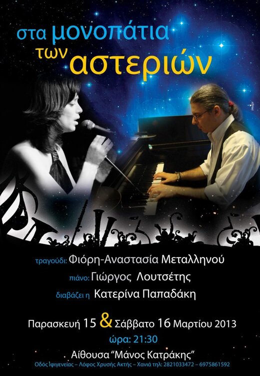 Μία παράσταση μουσικής, ποιητικού λόγου και αστρονομικών εικόνων στις 15 & 16 Μαρτίου 2013 στα Χανιά. Μια εμπειρία Ζωής! Κι ένα τραγούδι που γράφτηκε για την παράσταση: "Ο ΚΟΜΗΤΗΣ, Ο ΕΡΗΜΙΤΗΣ ΚΙ Ο ΑΛΗΤΗΣ" -Αναστασία Μεταλληνού