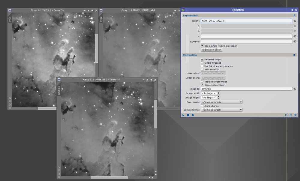 Στη συνέχεια μπορούμε να εφαρμόσουμε αυτά τα blend modes στο pixelmath για να συνθέσουμε τη LFHH με τη FINAL, αρκεί πρώτα να μετονομάσουμε LFHH=IMG1, FINAL=IMG2 Darken Min( IMG1, IMG2 ) Multiply IMG1 * IMG2 Color Burn (non-commutative) ~(~IMG1/ IMG2) Linear Burn IMG1 + IMG2 - 1 Lighten Max( IMG1, IMG2 ) Screen ~(~IMG1 * ~IMG2) Color Dodge (non-commutative) IMG1 / ~IMG2 Overlay (non-commutative) iif( IMG1 > 0.5, ~(~(2*(IMG1 - 0.5)) * ~IMG2), 2*IMG1*IMG2 ) Soft Light (?) (non-commutative) iif( IMG2 > 0.5, ~(~IMG1 * ~(IMG2 - 0.5)), IMG1*(IMG2 + 0.5) ) Hard Light (non-commutative) iif( IMG2 > 0.5, ~(~IMG1 * ~(2*(IMG2 - 0.5))), 2*IMG1*IMG2 ) ) Vivid Light (??) (non-commutative) iif( IMG2 > 0.5, ~(~IMG1/(IMG2 - 0.5)/2), IMG1/~(2*IMG2) ) Linear Light (non-commutative) iif( IMG2 > 0.5, IMG1 + 2*(IMG2 - 0.5), IMG1 + 2*IMG2 - 1 ) Pin Light (non-commutative) iif( IMG2 > 0.5, Max( IMG1, 2*(IMG2 - 0.5) ), Min( IMG1, 2*IMG2 ) ) Difference IMG1 -- IMG2 Exclusion 0.5 - 2*(IMG1 - 0.5)*(IMG2 - 0.5)