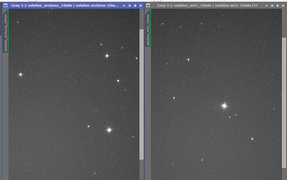 Γεια σου Θέμη Κάποια στιγμή πίστεψα ότι το πρόβλημα σχετίζεται με τις παραμέτρους που είχα επιλέξει για την αυτόματη οδήγηση. Έπρεπε να βρω το μαγικό συνδυασμό που ταιράζει με τον εξοπλισμό μου. Κάνοντας πολλές δοκιμές κατάφερα να έχω καλύτερη οδήγηση και καλύτερα άστρα όμως το πρόβλημα εξακολουθεί να υφίσταται. Παραθέτω τα αποτελέσματα από δυο 10 λεπτες που τράβηξα εχθές σε εστιακή 1280 mm. Μια κοντά στον Αρκτούρο ανατολικά και μια κοντά στο M51 στο ζενήθ. Όπως βλέπεις τα άστρα δείχουν πολύ πιο καλά τώρα σε σχέση με όλες τις προηγούμενες προσπάθειες μου. Η οδήγηση γίνεται μέσα από το δεύτερο τσιπάκι της sbig αφού είναι dual chip κάμερα. Τα πειράματα θα συνεχιστούν εστιάζοντας τώρα σε άλλα θέματα πέραν της αυτόματης οδήγησης. - Εστιαστής έχω τελικά κάμψη; - αφαίρεση focal reducer και σύνδεση απευθείας της CCD στο τηλεσκόπιο - σύνδεση μόνο της Canon στο τηλεσκόπιο - collimation Να δούμε τελικά τι φταίει αφού δεν είναι θέμα αυτόματης οδήγησης τελικά...