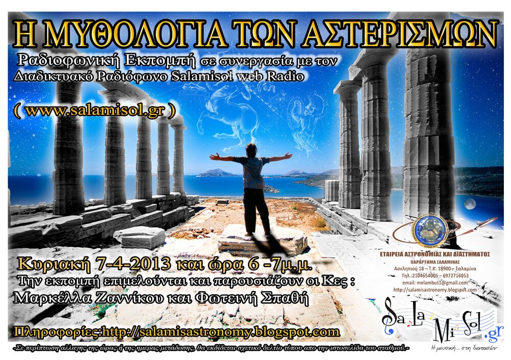 Η Εταιρεία Αστρονομίας & Διαστήματος ( Παράρτημα Σαλαμίνας ) σας εύχεται ΚΑΛΗ ΧΡΟΝΙΑ και σας προσκαλεί στην κοπή της πίττας την Κυριακή 10 Φεβρουαρίου 2013 και ώρα 10:30 στο Ξενοδοχείο << Melina Resort>> Λ. Αιαντείου 386 ( 9η Στάση) . Στην εκδήλωση θα παρευρεθεί και θα μιλήσει ο Επίκουρος Καθηγητής Αστροφυσικής του Εθνικού και Καποδιστριακού Πανεπιστήμιου Αθηνών Κος Μάνος Δανέζης , με θέμα << ΕΤΣΙ ΒΛΕΠΩ ΤΟΝ ΚΟΣΜΟ >> , που αποτελεί και τον τίτλο της ομώνυμης σειράς της Τηλεόρασης της ΕΤ 3. Με Τιμή Ο Πρόεδρος Ο Γραμματέας Κ. Ραπατζίκος Σ . Ράπτης