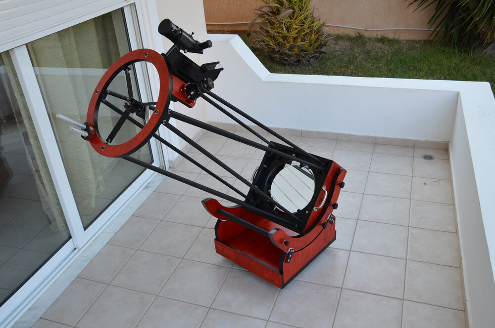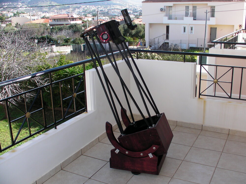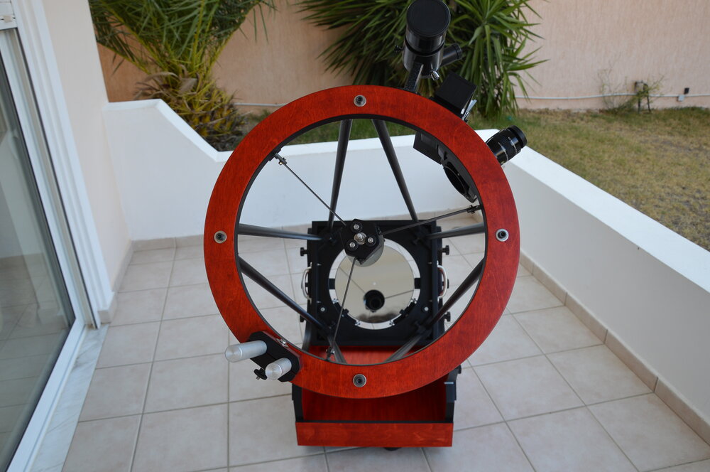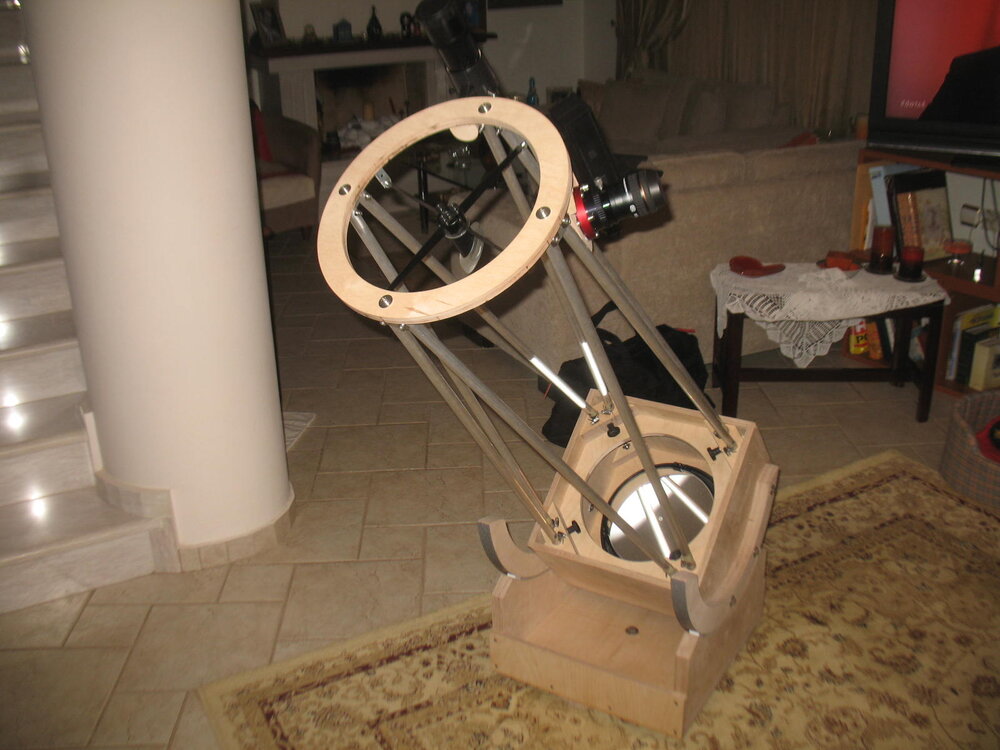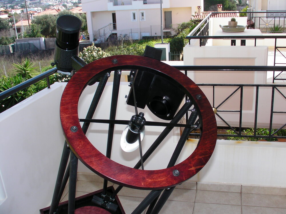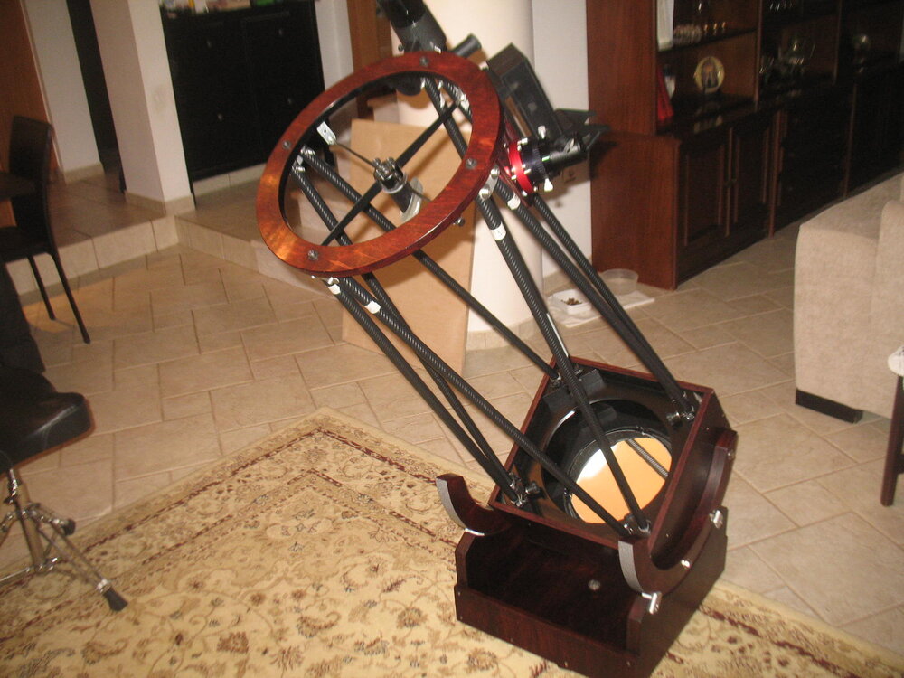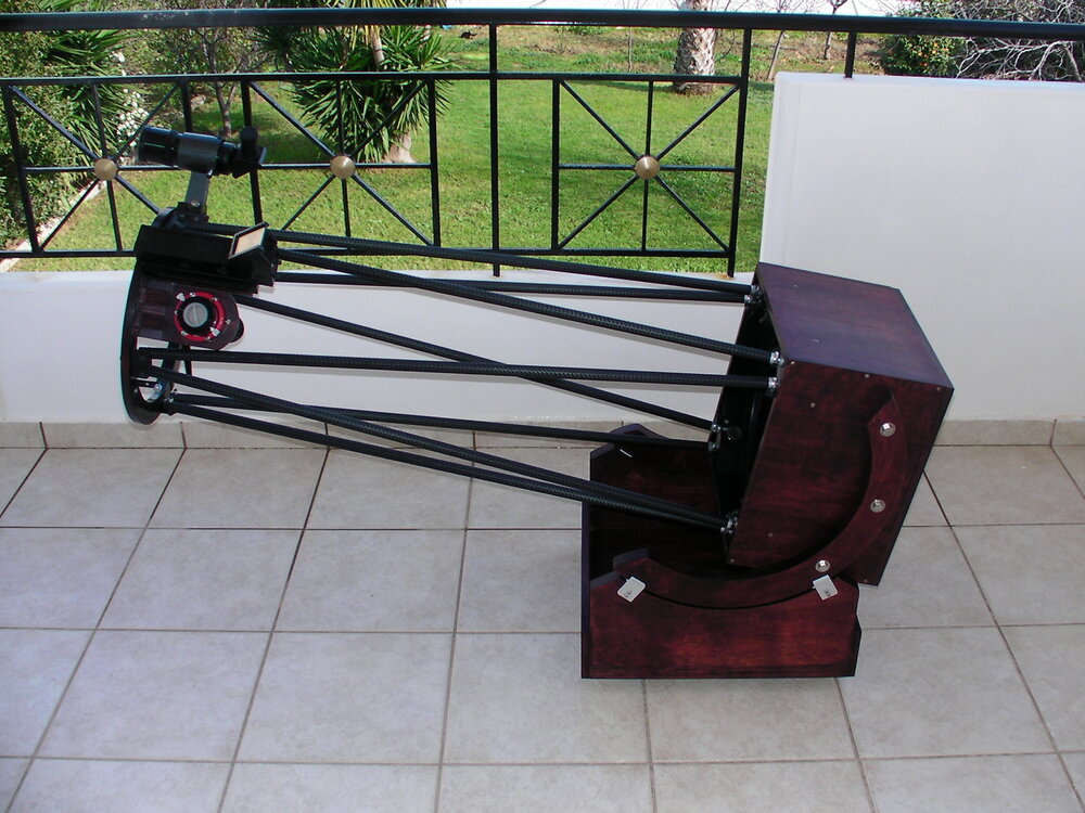 Καλησπέρα σε όλους. Μόλις ολοκλήρωσα με την κατασκευή του τηλεσκοπίου μου και ακολουθούν φωτογραφίες της τελικής του μορφής. Μου απέμεινε μόνο το ράψιμο ενός φωτοχιτωνίου. Τα ξύλινα μέρη του τηλεσκοπίου πρώτα βάφτηκαν με ανιλίνη οινοπνεύματος με απόχρωση μαόνι και στη συνέχεια εφαρμόστηκαν λούστρα νερού ή λούστρα πολυουρεθάνης (άνω κλωβός). Οι εσωτερικές επιφάνειες του άνω κλωβού και του mirror box βάφτηκαν με βερνικόχρωμα μαύρο ματ, όπως και οι γωνίες συνδεσης των αντιστηριγμάτων με τον άνω κλωβό καθώς και οι γωνίες στήριξης της αράχνης. Για να μειώσω όσο μπορούσα τις αντανακλάσεις αποφάσισα να ντύσω τα αντιστηρίγματα με μαύρο αυτοκόλλητο πλαστικό απομίμηση ανθρακονήματος.
