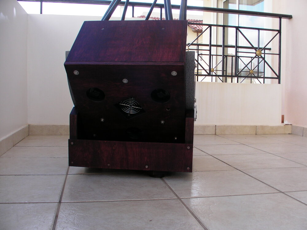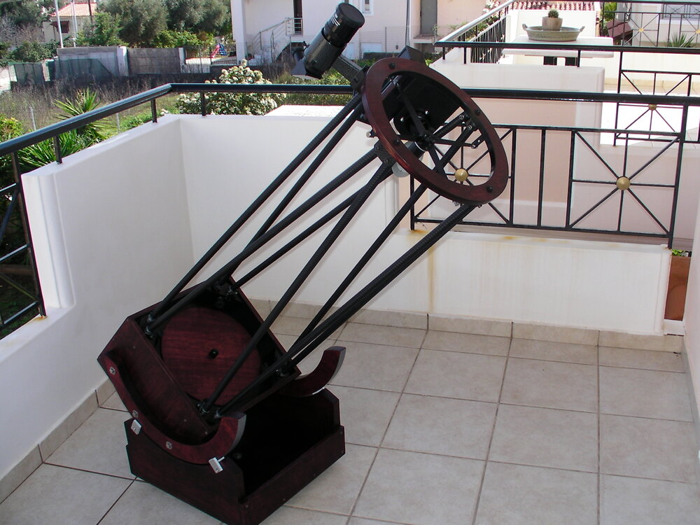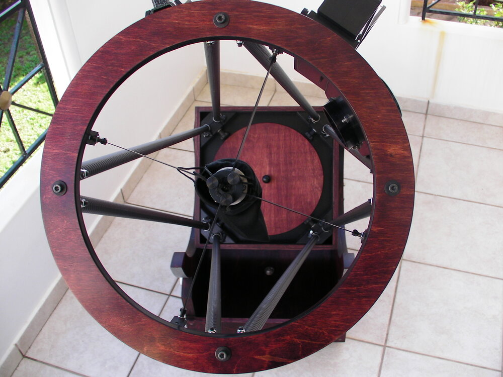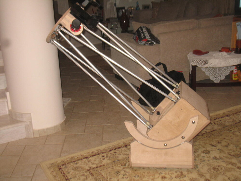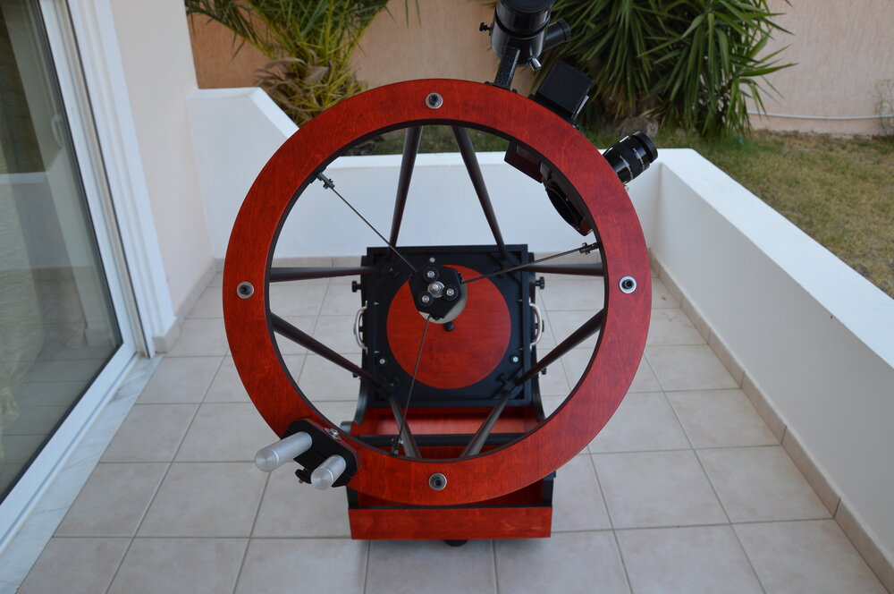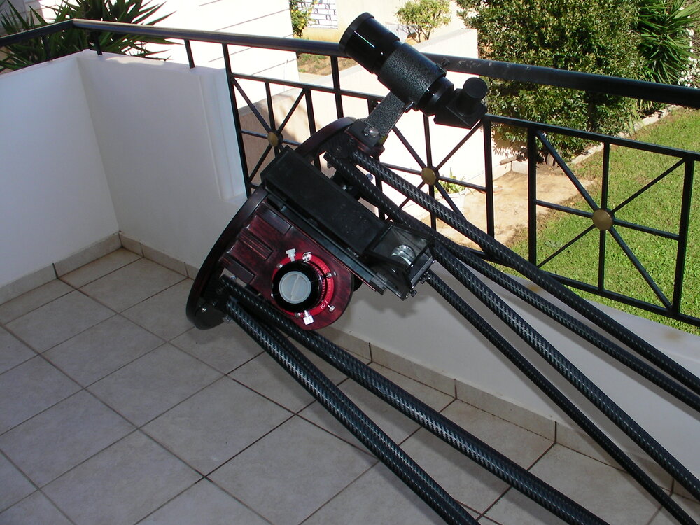 Καλησπέρα σε όλους. Μόλις ολοκλήρωσα με την κατασκευή του τηλεσκοπίου μου και ακολουθούν φωτογραφίες της τελικής του μορφής. Μου απέμεινε μόνο το ράψιμο ενός φωτοχιτωνίου. Τα ξύλινα μέρη του τηλεσκοπίου πρώτα βάφτηκαν με ανιλίνη οινοπνεύματος με απόχρωση μαόνι και στη συνέχεια εφαρμόστηκαν λούστρα νερού ή λούστρα πολυουρεθάνης (άνω κλωβός). Οι εσωτερικές επιφάνειες του άνω κλωβού και του mirror box βάφτηκαν με βερνικόχρωμα μαύρο ματ, όπως και οι γωνίες συνδεσης των αντιστηριγμάτων με τον άνω κλωβό καθώς και οι γωνίες στήριξης της αράχνης. Για να μειώσω όσο μπορούσα τις αντανακλάσεις αποφάσισα να ντύσω τα αντιστηρίγματα με μαύρο αυτοκόλλητο πλαστικό απομίμηση ανθρακονήματος.