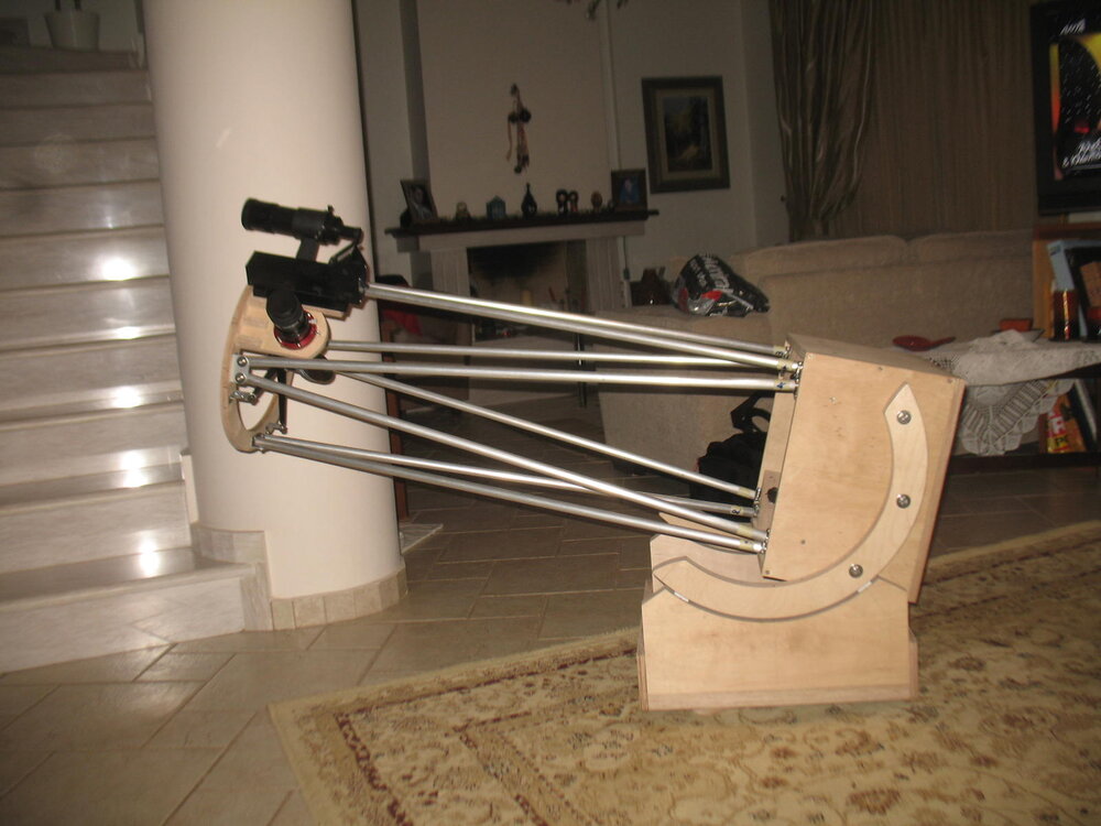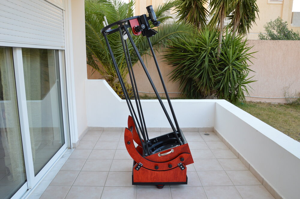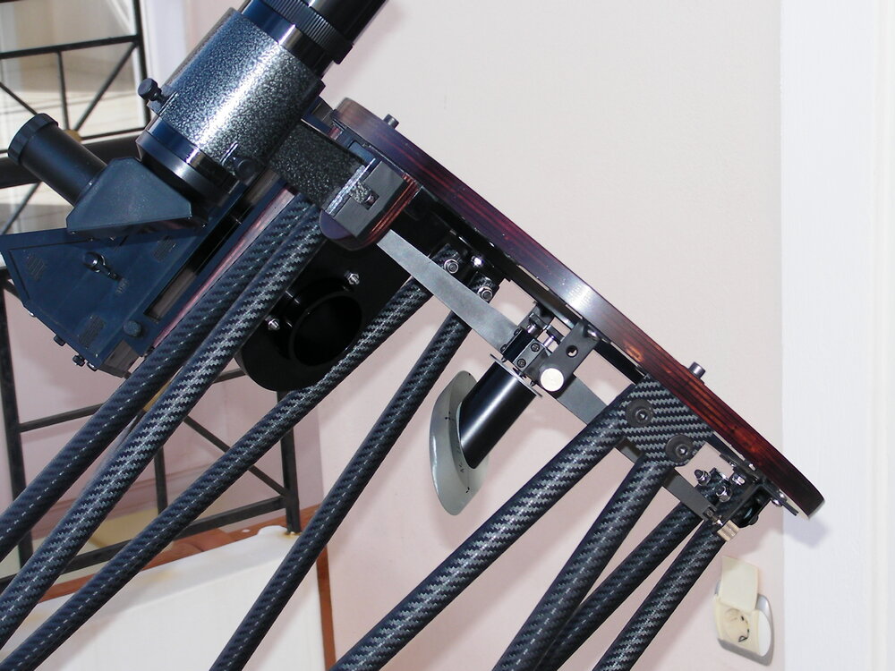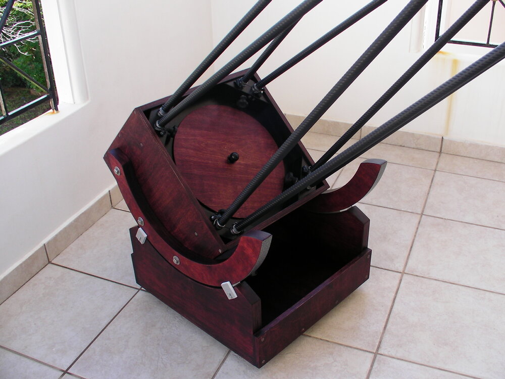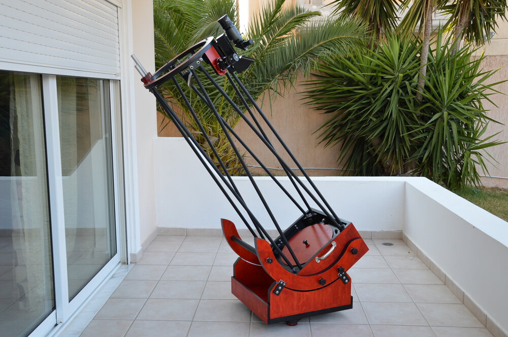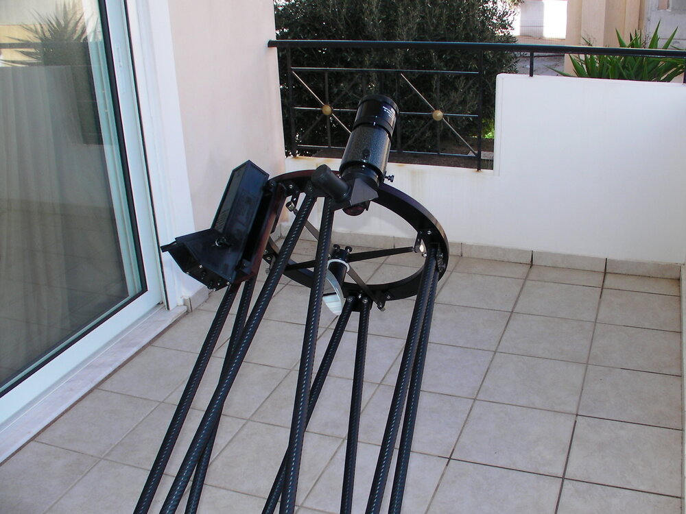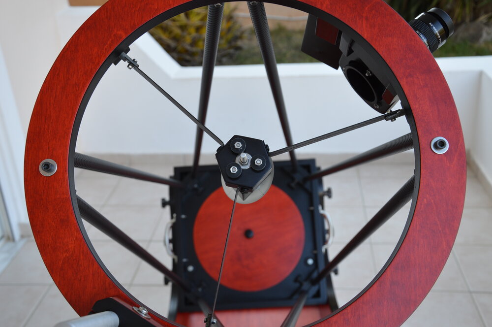 Καλησπέρα σε όλους. Μόλις ολοκλήρωσα με την κατασκευή του τηλεσκοπίου μου και ακολουθούν φωτογραφίες της τελικής του μορφής. Μου απέμεινε μόνο το ράψιμο ενός φωτοχιτωνίου. Τα ξύλινα μέρη του τηλεσκοπίου πρώτα βάφτηκαν με ανιλίνη οινοπνεύματος με απόχρωση μαόνι και στη συνέχεια εφαρμόστηκαν λούστρα νερού ή λούστρα πολυουρεθάνης (άνω κλωβός). Οι εσωτερικές επιφάνειες του άνω κλωβού και του mirror box βάφτηκαν με βερνικόχρωμα μαύρο ματ, όπως και οι γωνίες συνδεσης των αντιστηριγμάτων με τον άνω κλωβό καθώς και οι γωνίες στήριξης της αράχνης. Για να μειώσω όσο μπορούσα τις αντανακλάσεις αποφάσισα να ντύσω τα αντιστηρίγματα με μαύρο αυτοκόλλητο πλαστικό απομίμηση ανθρακονήματος.